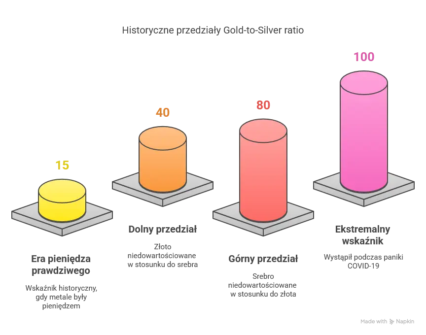 Wskaźnik Gold to Silver Ratio, często określany w skrócie jako (GSR) to kluczowy parametr dla inwestorów zainteresowanych rynkiem metali szlachetnych, określający ile uncji srebra potrzeba, by kupić jedną uncję złota. Ten ciekawy i zarazem bardzo prosty wskaźnik ekonomiczny służy jako barometr relatywnej wartości obu kruszców, pomagając inwestorom podejmować strategiczne decyzje o dywersyfikacji portfela. Historycznie gold to silver ratio waha się w szerokim zakresie – od około 15:1 w starożytności do nawet 100:1 w czasach kryzysu gospodarczego czy po prostu gorszego okresu dla srebra. Analiza tego wskaźnika pozwala zidentyfikować potencjalne momenty niedowartościowania lub przewartościowania srebra względem złota, co może wskazywać optymalne punkty wejścia na rynek. Inwestorzy regularnie monitorujący wskaźnik Gold to Silver Ratio często wykorzystują jego ekstremalne wartości jako sygnały do strategicznej zamiany jednego metalu na drugi, maksymalizując potencjalne zyski w długoterminowej perspektywie inwestycyjnej.
