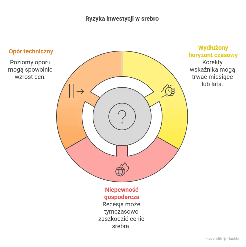 Chociaż ekstremalny wskaźnik złota do srebra sugeruje atrakcyjną okazję, rozsądni inwestorzy powinni uwzględnić kilka potencjalnych ryzyk. Jednym z nich jest chociażby wydłużony horyzont czasowy korekty wskaźnika nie zawsze następują szybko, czasami mogą trwać miesiące lub nawet całe lata. To co teraz obserwujemy to niepewność gospodarcza – w przypadku poważnej globalnej recesji, srebro może tymczasowo ucierpieć ze względu na swoje zastosowania przemysłowe. Kolejnym zagrożeniem jest opór techniczny – cena srebra może napotkać poziomy oporu, które mogą spowolnić wzrosty cen, nawet jeśli fundamenty wyglądają obiecująco.