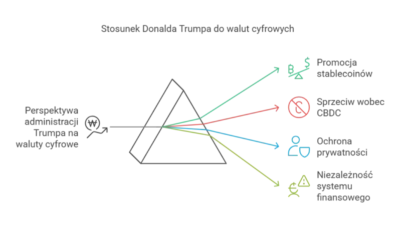 Jednym z głównych celów rozporządzenia jest promowanie stablecoinów opartych na dolarze amerykańskim. Prezydent Trump zdecydowanie sprzeciwił się idei cyfrowej waluty banku centralnego (CBDC), nazywając ją „zagrożeniem dla wolności i stabilności finansowej”. Administracja Trumpa zamierza przeciwdziałać emisji i obrotowi CBDC w USA, podkreślając konieczność ochrony prywatności obywateli i niezależności systemu finansowego.