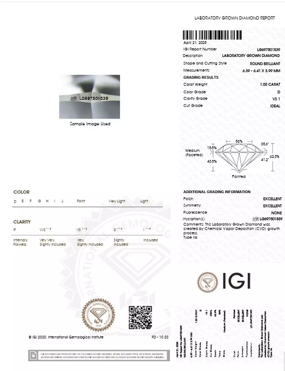 Przedstawiamy ciekawą alternatywę dla naturalnych diamentów- Diament laboratoryjny 1.00 Ct | D | VS1. Diament laboratoryjny jest identyczny pod względem składu chemicznego, struktury i właściwości optycznych z naturalnym diamentem. Prezentowany diament posiada certyfikat jednego z 3 najbardziej renomowanych instytutów gemmologicznych na świecie, którzy posiadają certyfikację Kimberley Process.