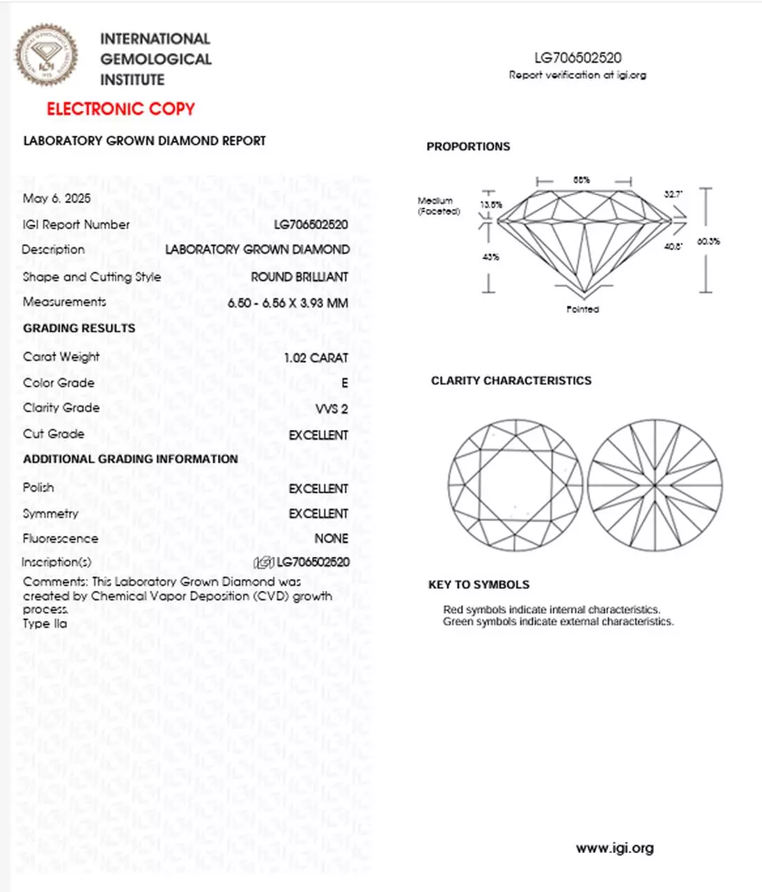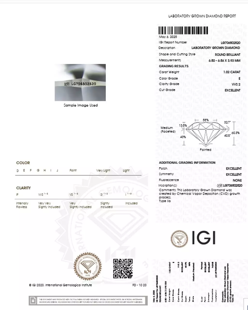 Cechy diamentu laboratoryjnego 1.02 Ct | E | VVS2: