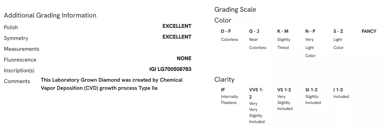 Barwa: E – prawie bezbarwny diament, jeden z najwyższych stopni w skali GIA, minimalnie różniący się od perfekcyjnej barwy D.