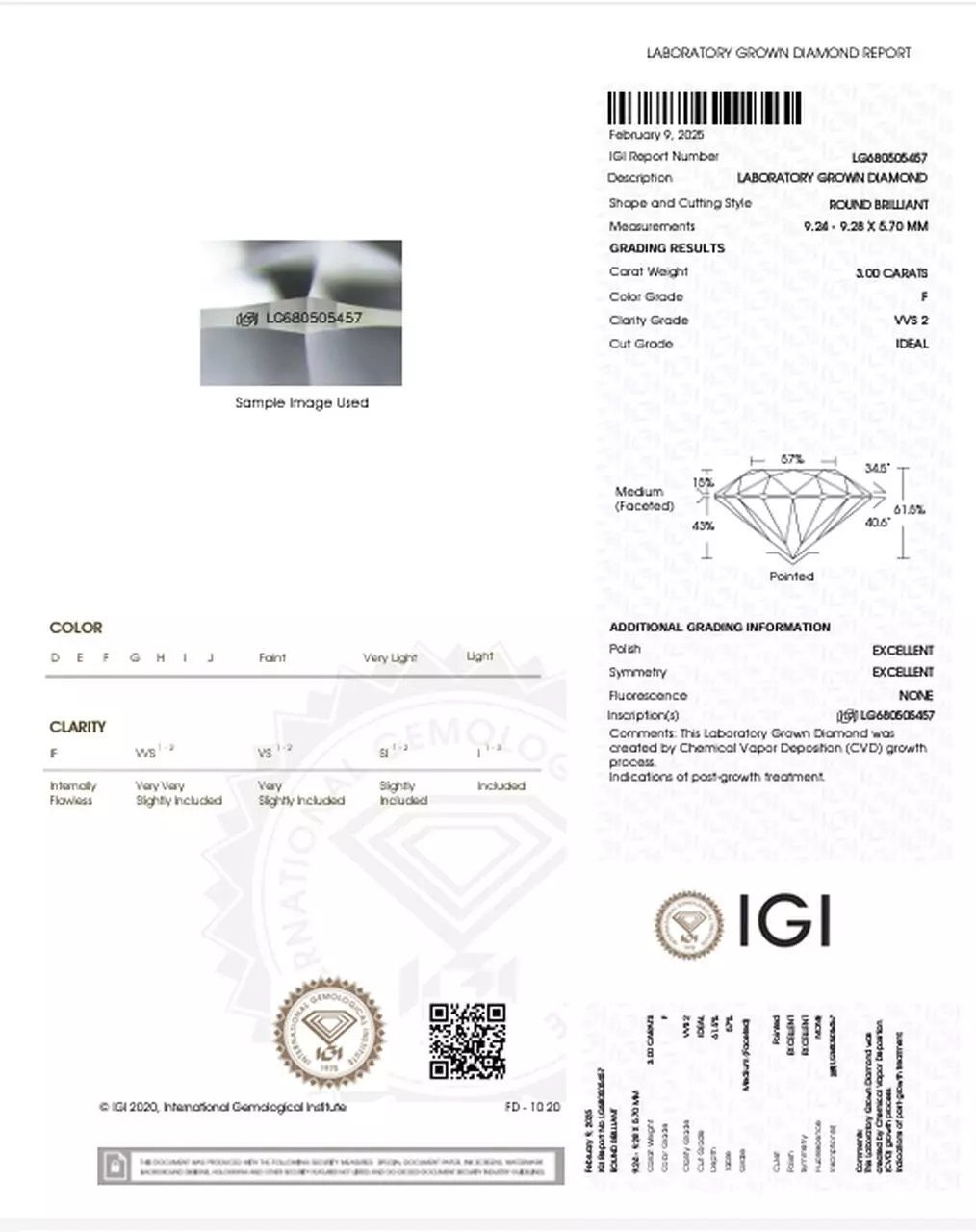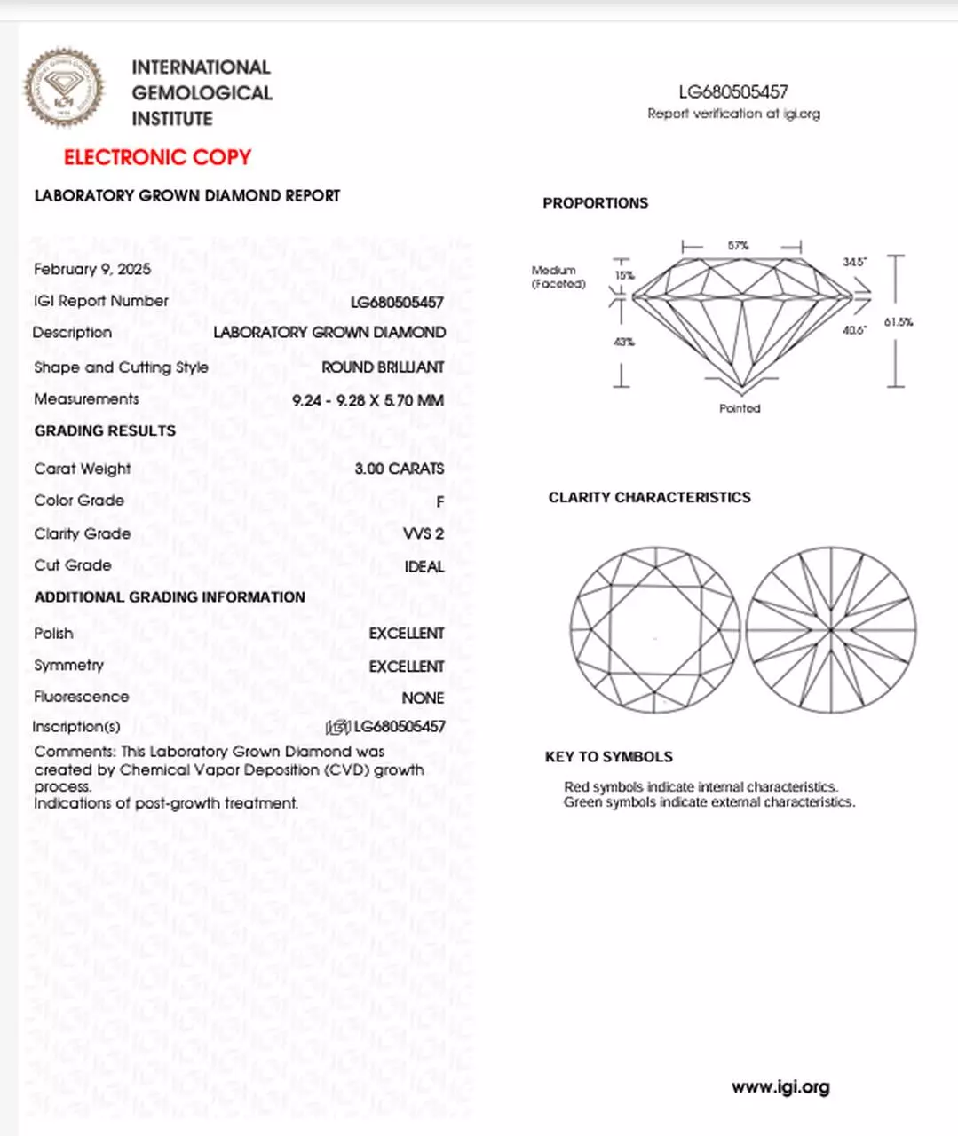 Cechy diamentu laboratoryjnego 3.00 Ct | F | VVS2: