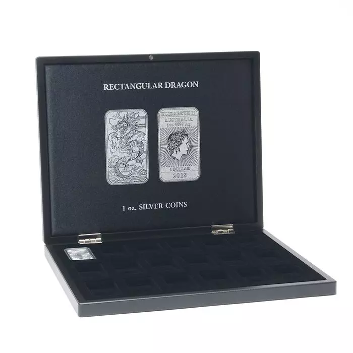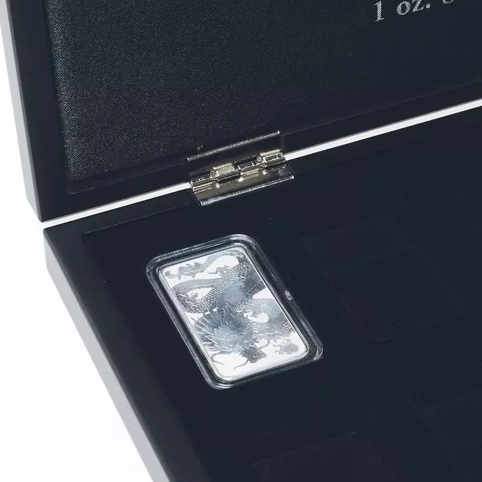 Etui Volterra to elegancka, czarna skrzynka służąca do przechowywania sztabko- monet Dragon zapakowanych w kapsel ochronny.