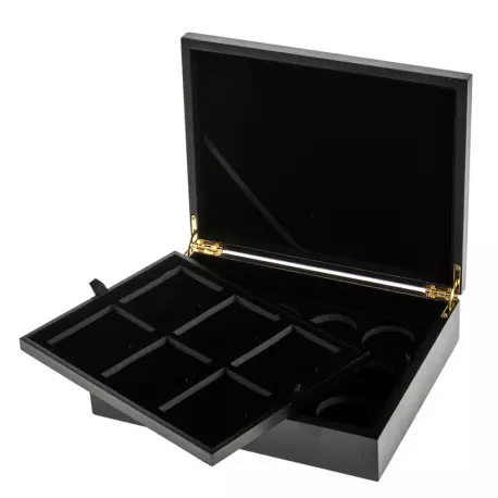 Czarne pudełko wykonane jest z drewna i posiada 3 wkładki, w których można umieścić po 6 monet.