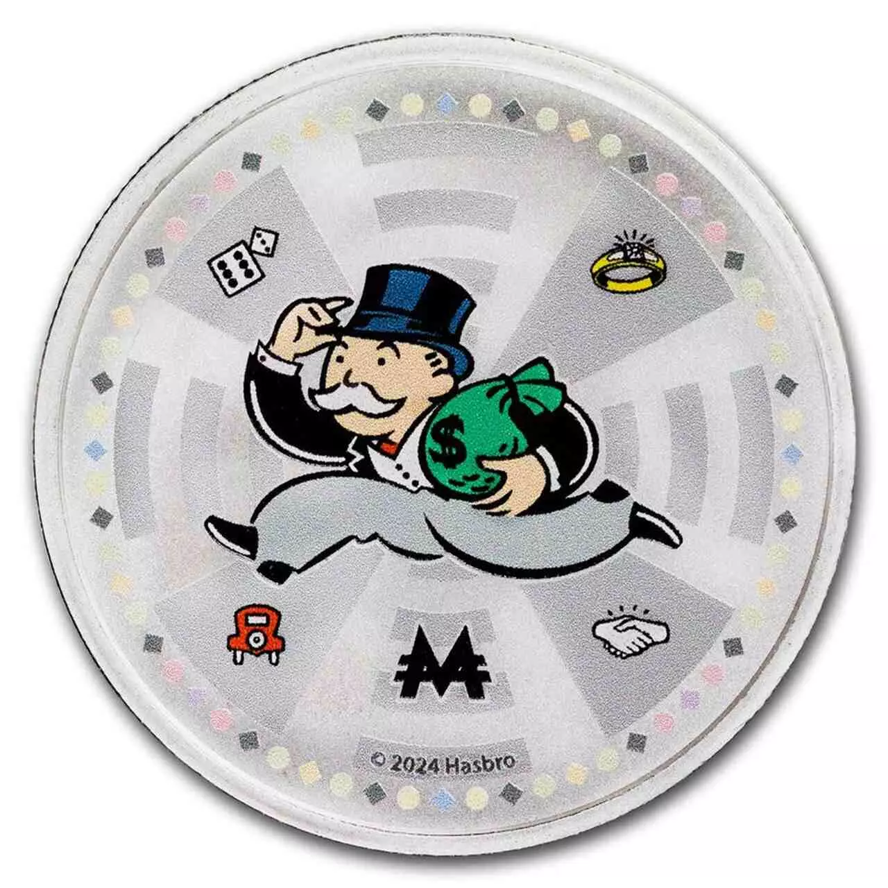 Mr. Monopoly zawiera jedną uncję srebra najwyższej próby. Moneta w wersji kolorowanej.