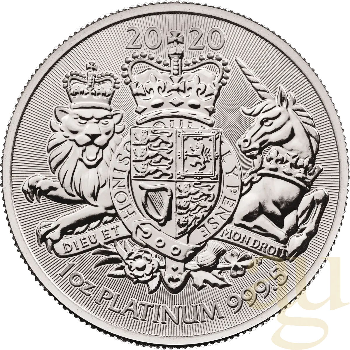 Druga ćwiartka przedstawia szalejącego lwa reprezentującego Szkocję. Na trzecim miejscu reprezentowana jest harfa Irlandii. Tarcza jest podtrzymywana z lewej strony siłą koronowanego lwa Anglii. Po jej prawej stronie stoi niesamowity jednorożec Szkocji. Zwieńczeniem heraldycznej tarczy jest oszałamiająca królewska korona. Zgodnie z oryginalnym projektem, tarcza otacza skórzana podwiązka ze sprzączką, w tym napis „HONI SOIT QUI MAL Y PENSE”, w tłumaczeniu: „Wstydź się temu, kto myśli o tym źle!” Ogólny projekt jest podkreślony mikro-grawerowanym, cienkim wzorem gwiazdy, wypełniającym pole tła. Napisy zawierają „2021. 1 uncja FINE SILVER 999. ” Royal Arms stała się silna wobec narodów świata jako najbardziej rozpoznawalny symbol suwerenności Wielkiej Brytanii, a także dumy jej narodu. Modernizacja tego projektu będzie kontynuować to uznanie również w przyszłości!