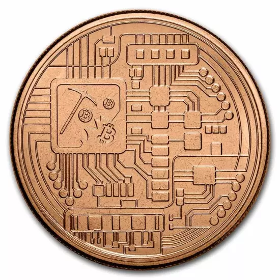 Awers zdobi kilof w towarzystwie trzech małych logo Bitcoin. Symbolizuje to proces uzyskiwania wirtualnych monet, z nowoczesnym projektem linii reprezentującym chip komputerowy.