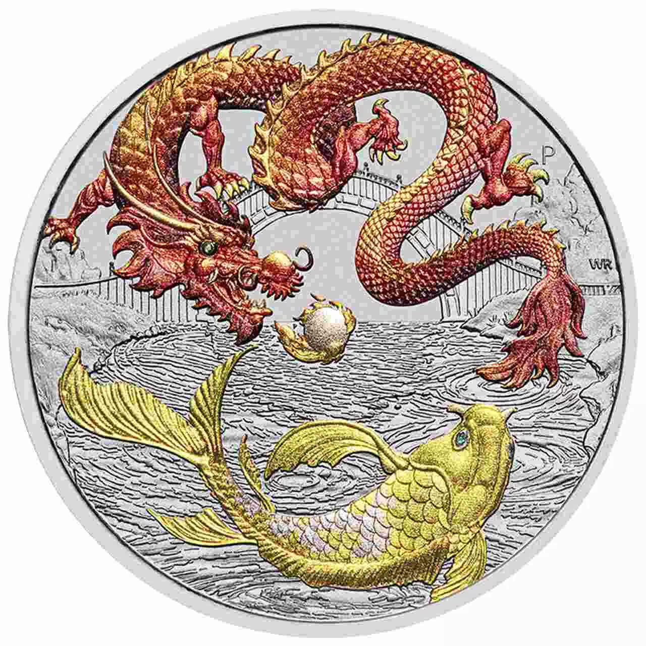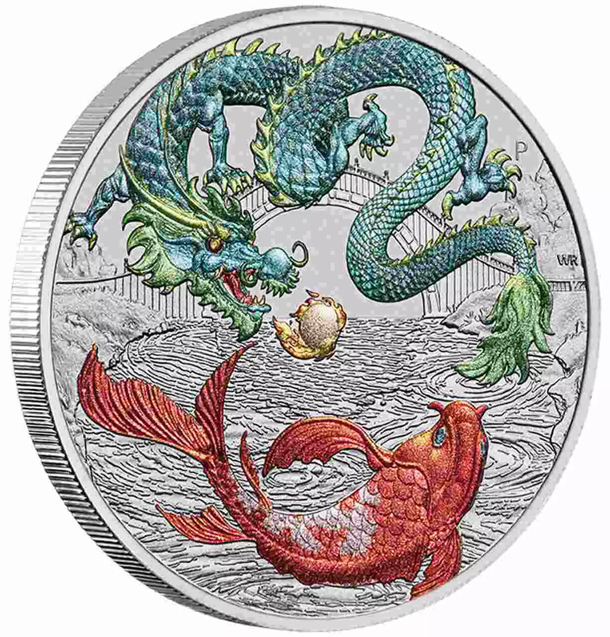 Dragon & Koi zawiera jedną uncję czystego srebra próby 999. Moneta w wersji kolorowanej.