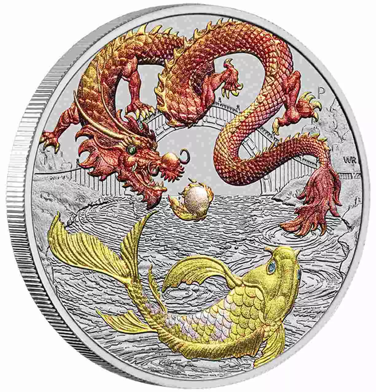 Dragon & Koi to srebrny walor próby 999 o wadze jednej uncji. Moneta posiada kolorowy nadruk.