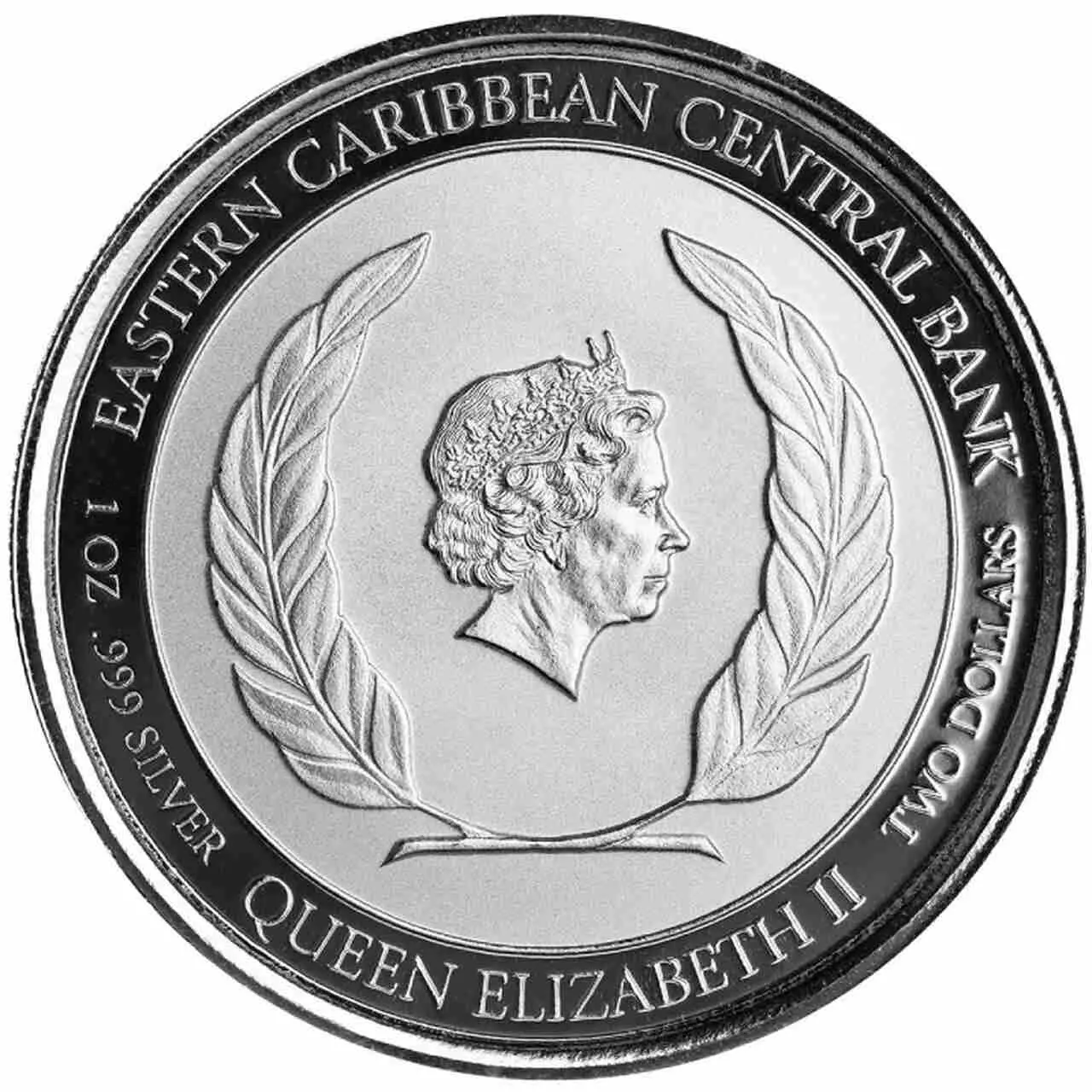 Awers zdobi podobizna Królowej Elżbiety II w otoczeniu liści palmowych.