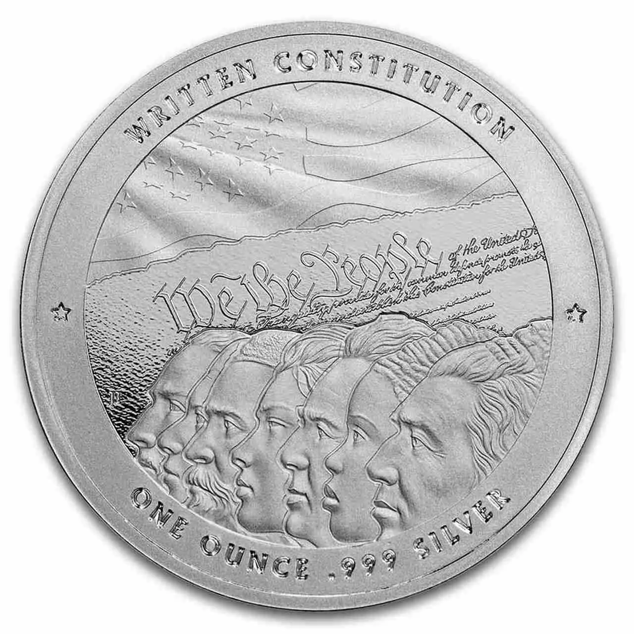Awers ukazuje amerykańską flagę falującą na wietrze z górną częścią Konstytucji USA. Pod nią widzimy wizerunki ludzi różnego pochodzenia.