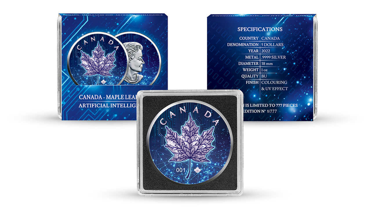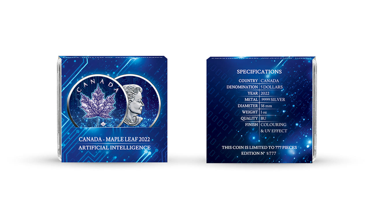 Przedstawiamy Państwu monetę z nowej, wyjątkowej serii Artificial Intelligence. W skład serii wchodzić będzie Chińska Panda, Amerykański Orzeł oraz prezentowany Kanadyjski Liść Klonowy. Monety zostaną ukazane w nowej, nieznanej dotąd odsłonie.