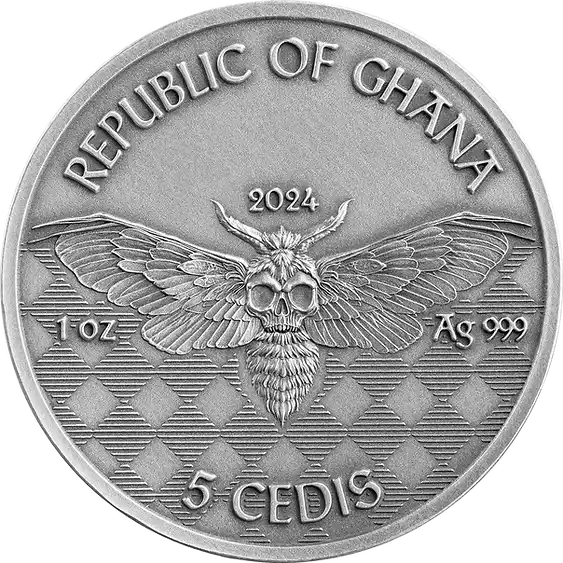 Awers monety przedstawia charakterystycznego ćmę-trupią główkę w centrum, otoczoną wzorem przypominającym ludzką czaszkę na grzbiecie owada. Na górze monet umieszczono nazwę emitenta oraz rok emisji, a na dole znajduje się nominał.