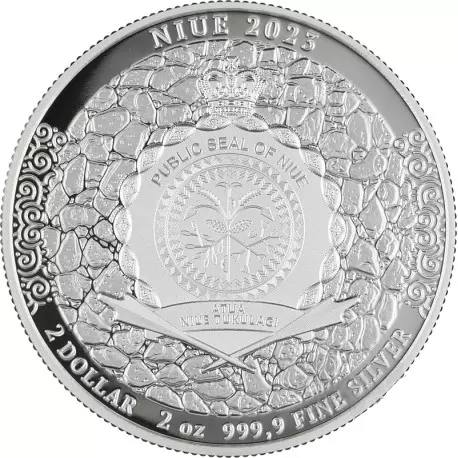 Awers zdobi herb Niue na tle skał.