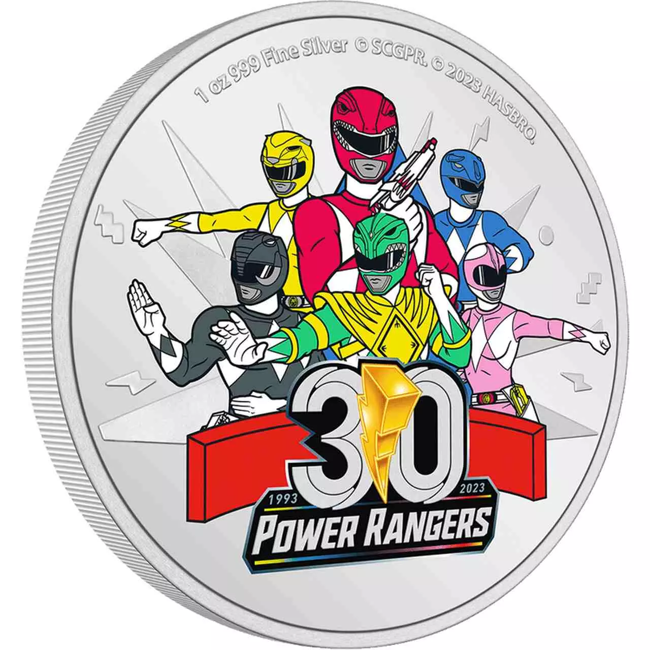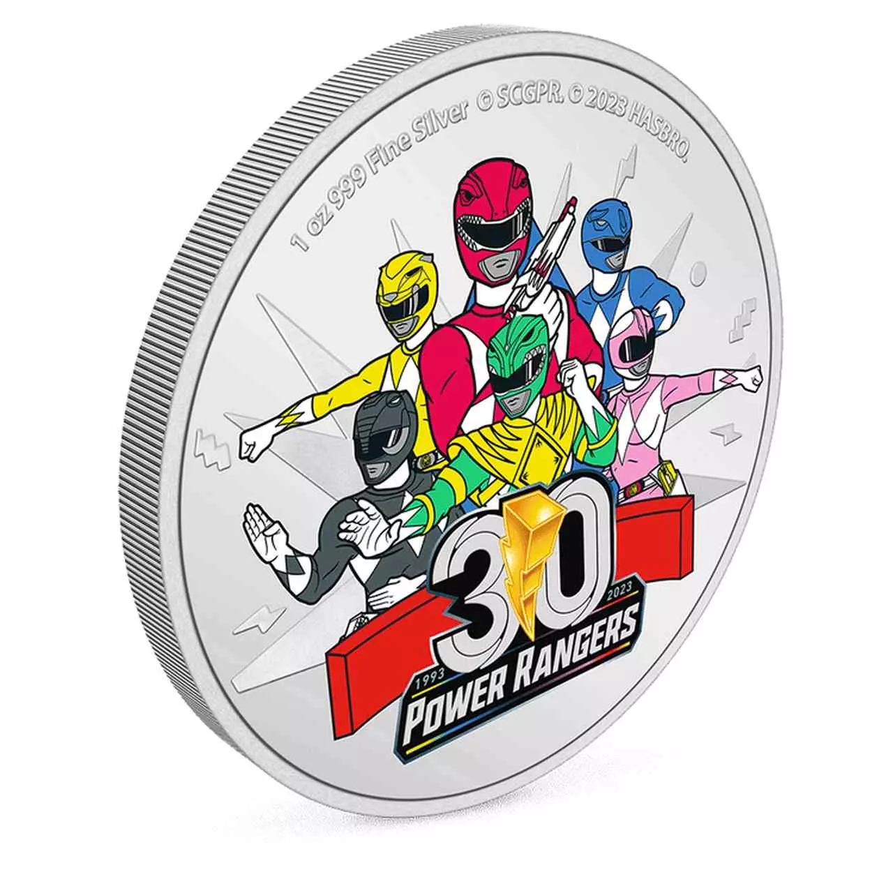 Power Rangers 30th Anniversary to walor wybity ze srebra próby 999 o wadze jednej uncji. Moneta w wersji kolorowanej.