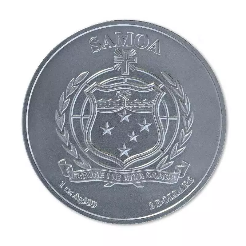 Awers ukazuje herb Samoa, wagę waloru oraz próbę metalu.
