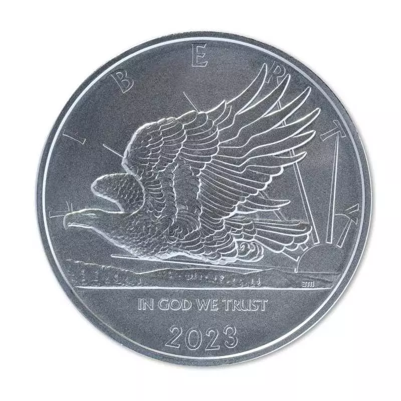 Rewers monety przedstawia lecącego orła oraz napisy „Liberty”, „In God We Trust”, „2023” i inicjały „JM” – John Mercanti.