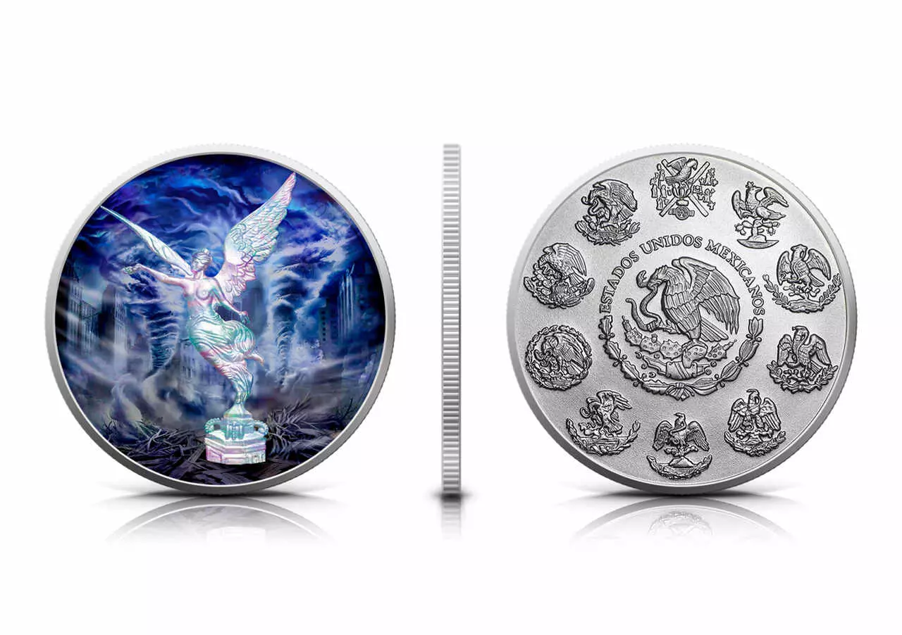 Mexico Libertad Air to srebrna moneta Mexico Libertad o wadze jednej uncji, która została wzbogacona o efekt Metallic Colours oraz Holograms. Dzięki tym efektom moneta uzyskała wyjątkowy charakter.
