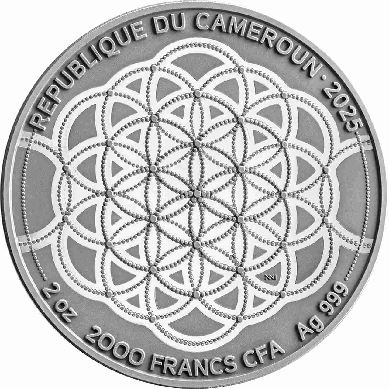 Awers ukazuje elegancką, geometryczną mozaikę oraz podstawowe informacje o monecie.