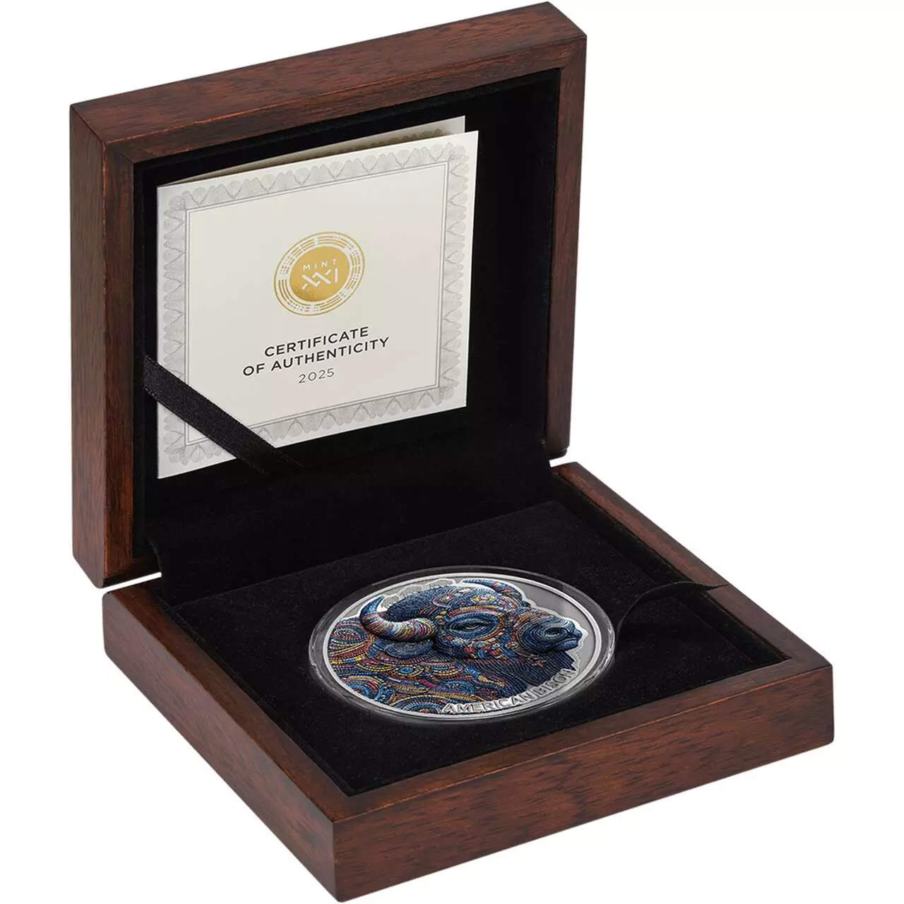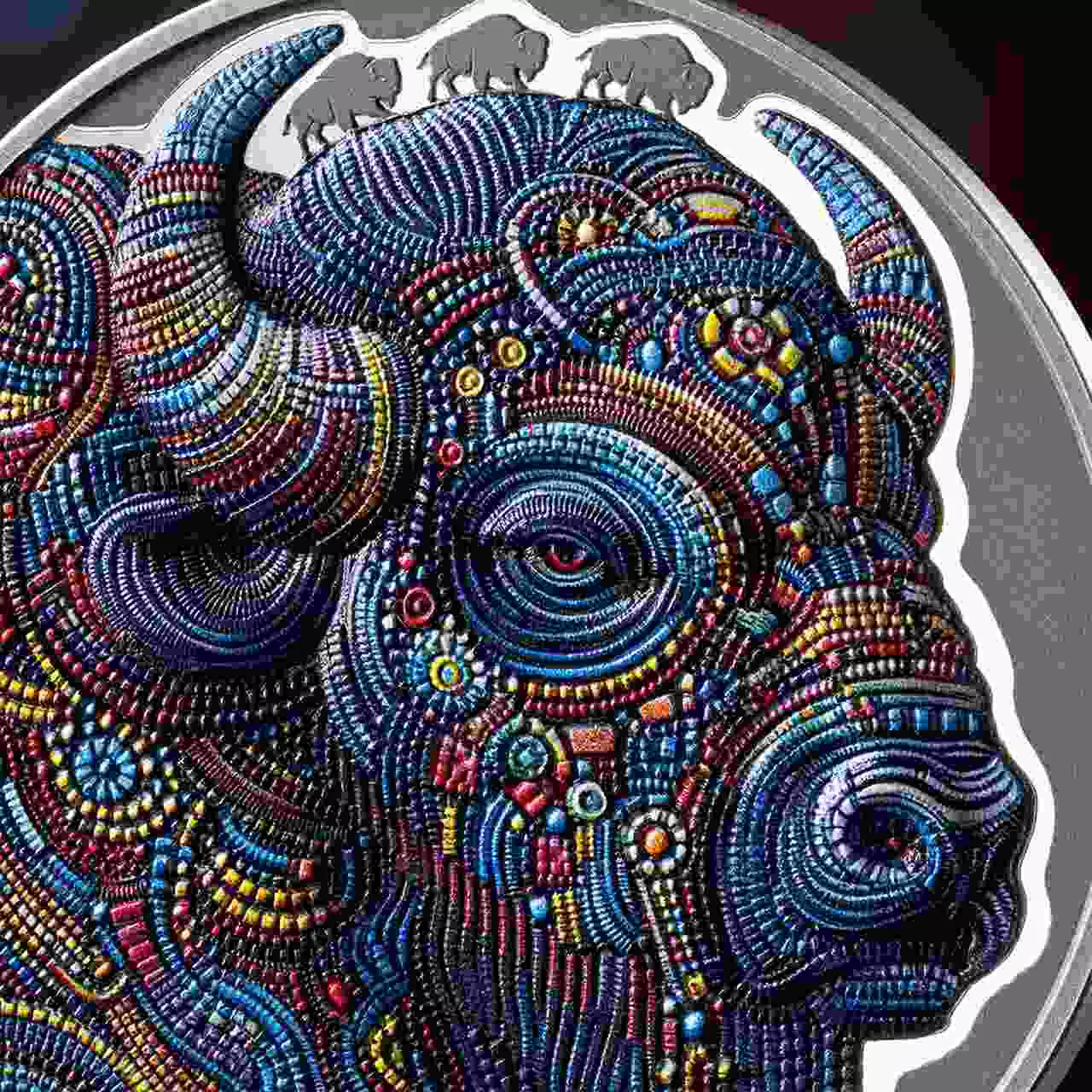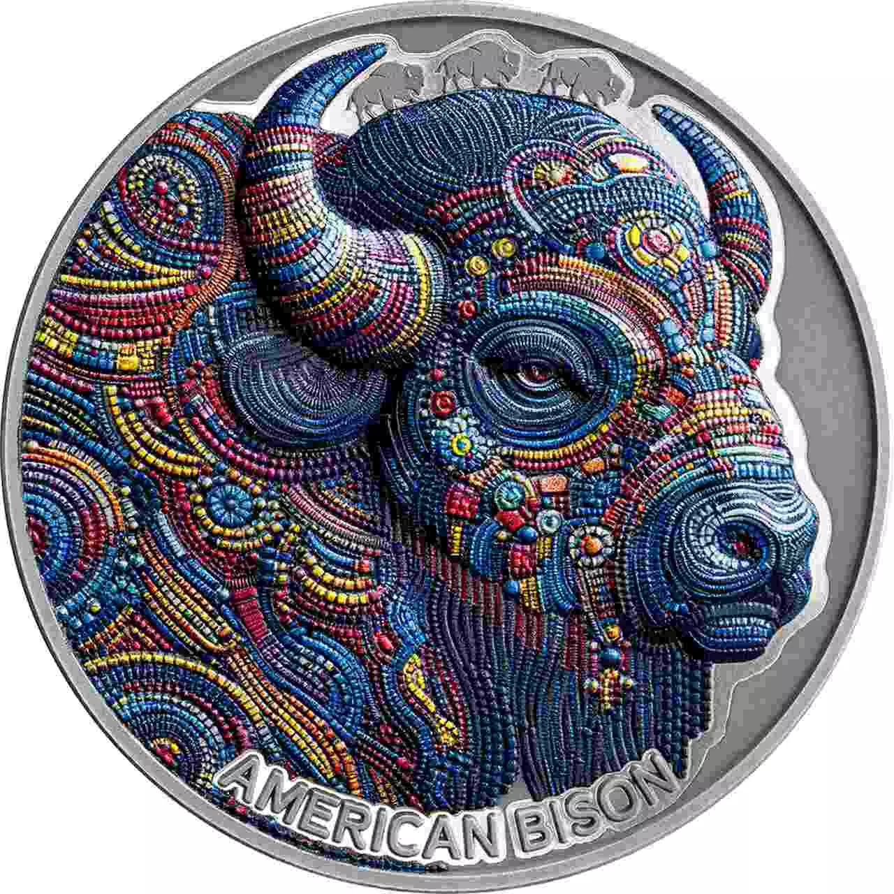 American Bison został wybity ze srebra najwyższej próby w jakości high relief. Walor o wadze dwóch uncji w niezwykły sposób łączy relief z misternym cyfrowym drukiem, inspirowanym bogatymi motywami tekstylnymi kultur rdzennych Amerykanów. Moneta została stworzona z wyjątkowym efektem koralikowym i selektywnym polerowaniem i stanowi celebracja tożsamości, odporności i dzikiego ducha.