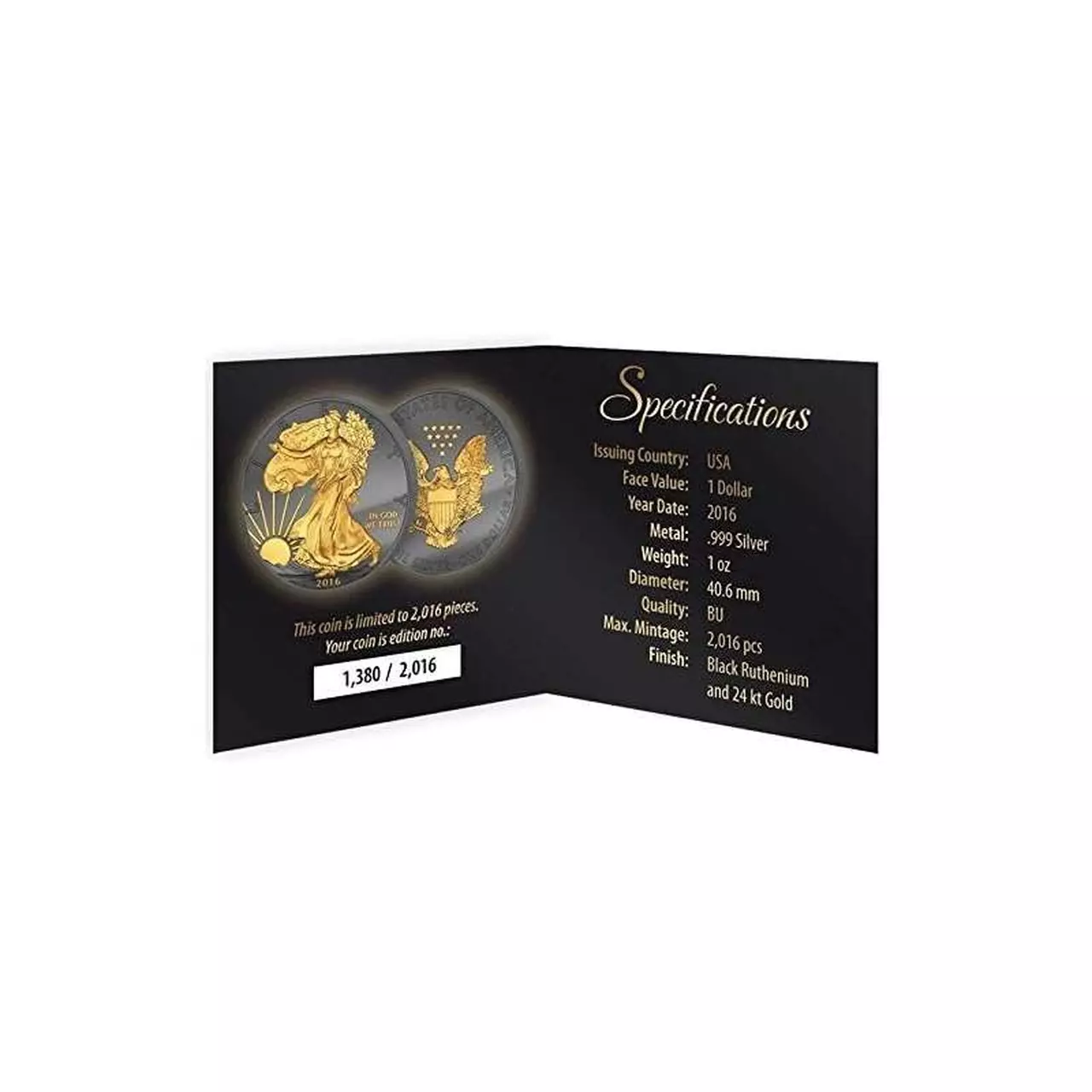Amerykański Orzeł Golden Enigma to srebrny walor próby 999 o wadze jednej uncji, który został pokryty specjalną czarną warstwą rutenu, a wybrane elementy zostały pozłocone 24- karatowym złotem, dzięki czemu moneta uzyskała wyjątkowy luksusowy wygląd. Zastosowanie tego typu uszlachetnień wyróżnia monetę na tle klasycznych wydań, czyniąc z niej prawdziwe dzieło sztuki.