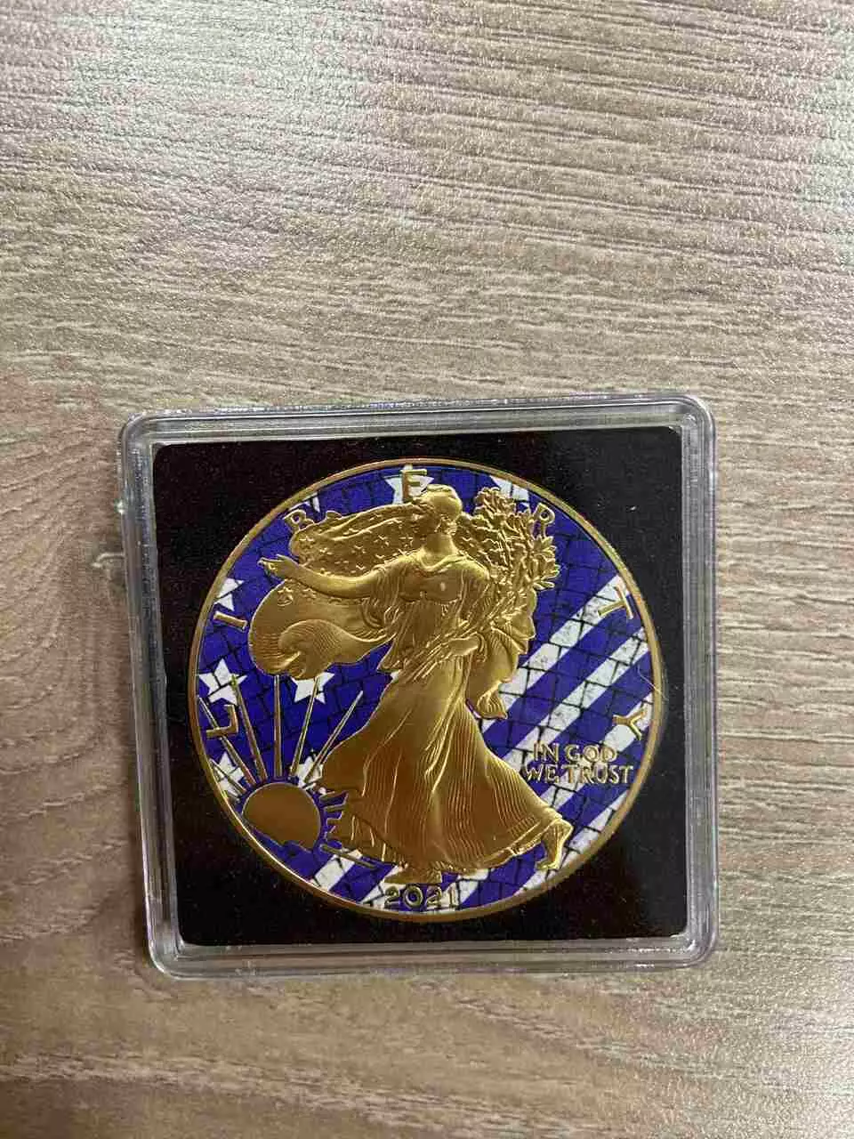Awers monety ukazuje pozłocony wizerunek Lady Liberty, jedną z najważniejszych ikon amerykańskiej numizmatyki na tle mozaiki w postaci części flagi. Złocone wykończenie podkreśla postać Lady, nadając całości elegancji.