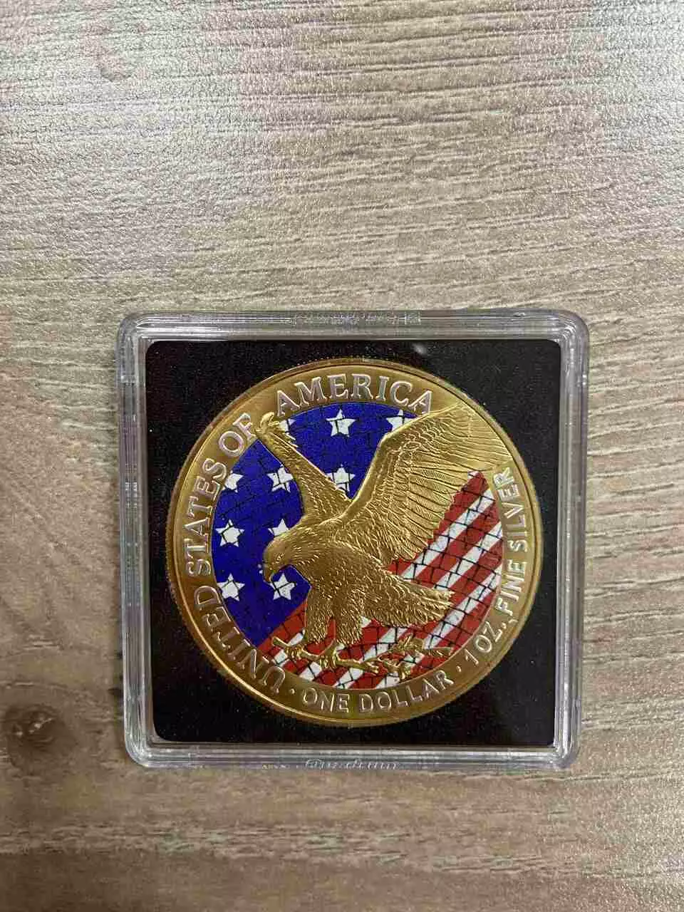 Rewers monety ukazuje wizerunek pozłoconego orła na tle amerykańskiej flagi, nadając monecie wyjątkowego charakteru.