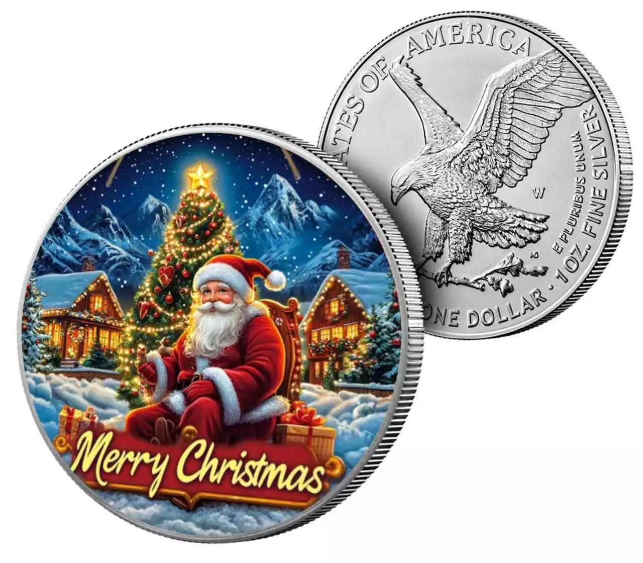 Amerykański Orzeł Merry Christmas zawiera jedną uncję czystego srebra próby 999. Moneta została wzbogacona o kolorowy nadruk UV.