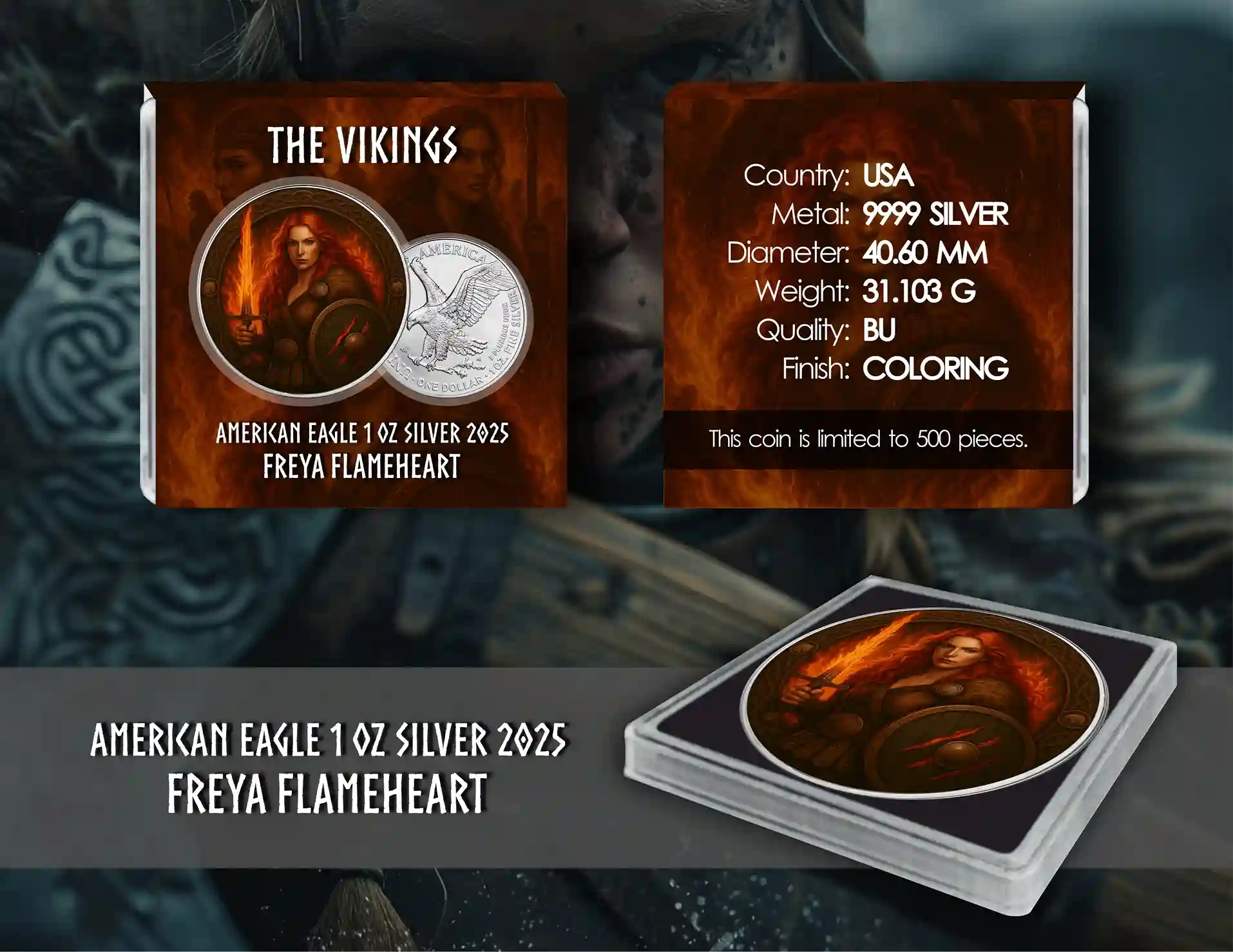 Freya Flameheart to następny srebrny walor wyprodukowany w ramach serii The Vikings. Cała seria oddaje hołd niesamowitym wojownikom z najbardziej fascynujących kultur w historii. Freya Flameheart to wyjątkowy numizmat łączący w sobie głęboką symbolikę historii wikingów, wyjątkowy design oraz limitowany nakład. Moneta cieszy się dużym zainteresowaniem wśród kolekcjonerów i stanowi wyjątkowe wzbogacenie każdej kolekcji. Limitowany nakład, połączony z kunsztem artystycznym, sprawia, że jej wartość kolekcjonerska systematycznie rośnie, zwiększając również atrakcyjność na rynku inwestycyjnym