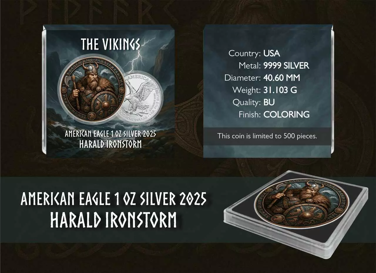 Harald Ironstorm to srebrna moneta bulionowa Amerykański Orzeł o wadze jednej uncji. Walor posiada kolorowy nadruk UV.
