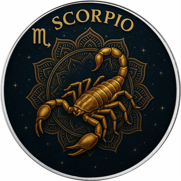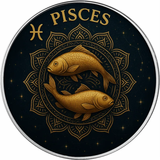 Na awersie widnieje centralne słońce otoczone pełnym kręgiem dwunastu znaków zodiaku. Złote symbole rozmieszczone na ciemnym tle tworzą harmonijną, elegancką kompozycję, która podkreśla astrologiczny charakter monety. Dookolne ornamenty wzbogacają projekt, nadając mu głębi i mistycznego charakteru.