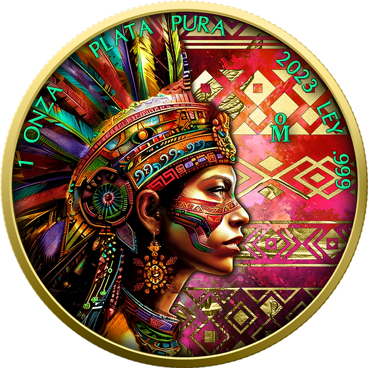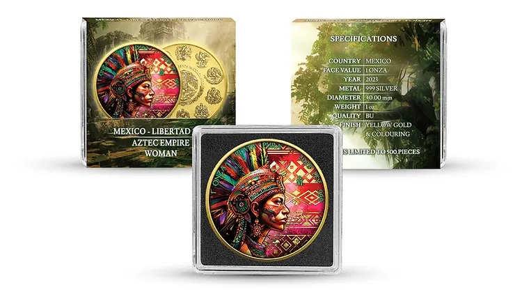 Aztec Woman stanowi uszlachetnioną wersję srebrnej monety Libertad. Moneta o wadze jednej uncji została dwustronnie pozłocona oraz zawiera kolorowy nadruk UV.