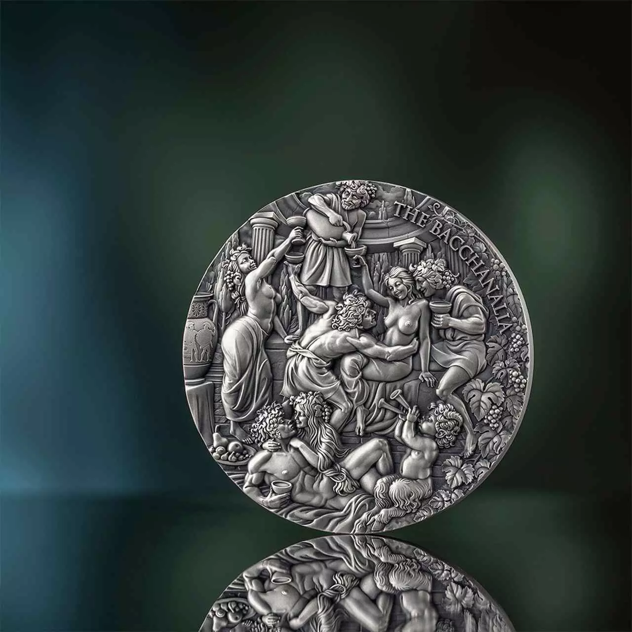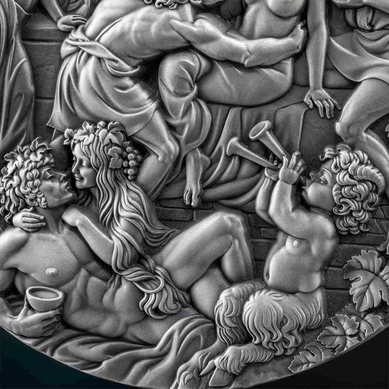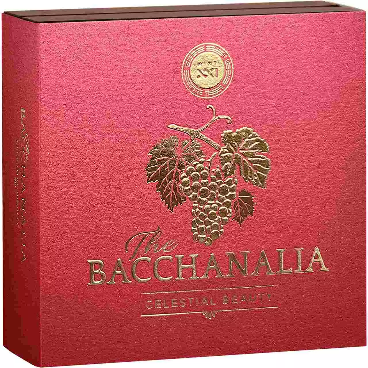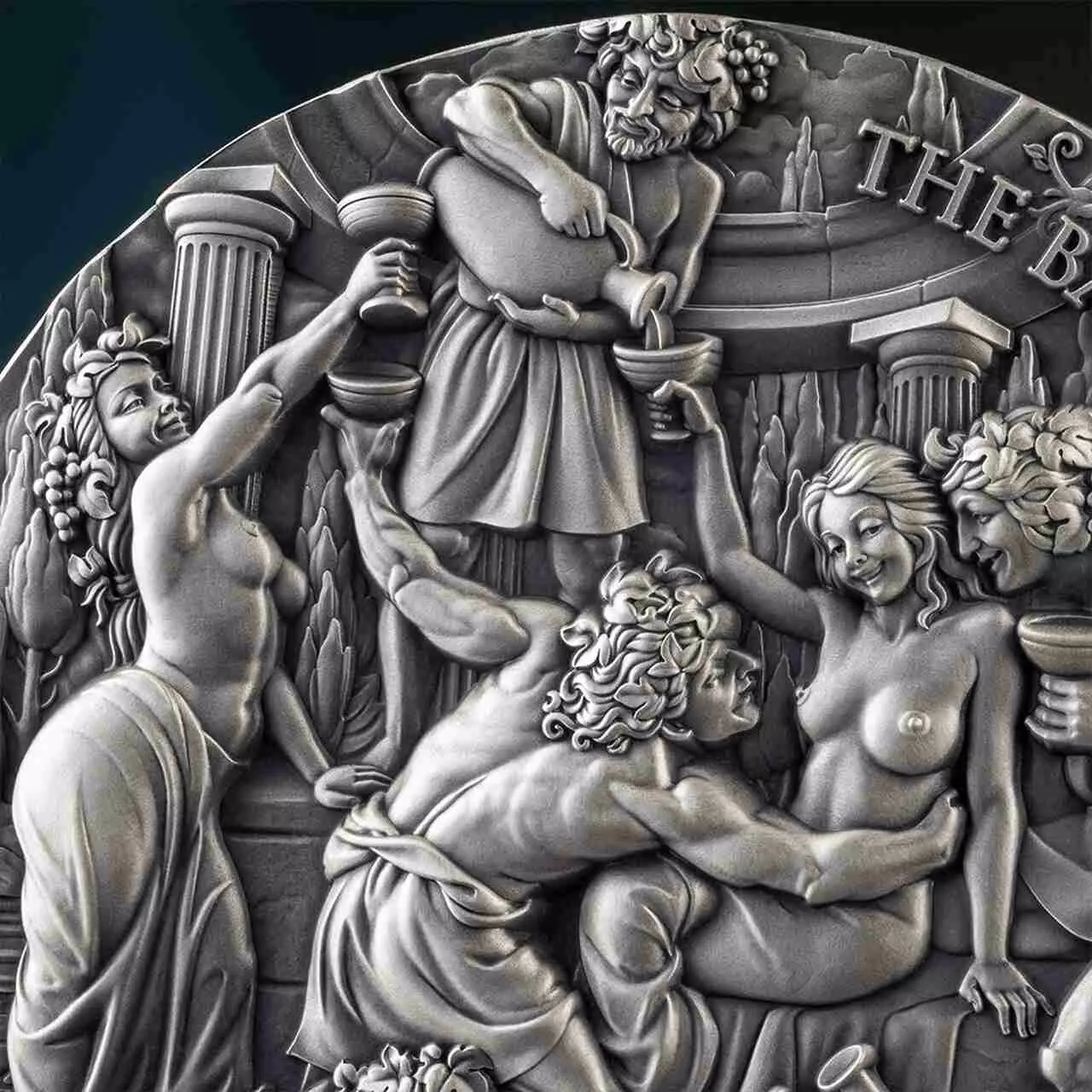 Bacchanalia to srebrny walor próby 999 o wadze pięciu uncji wybity w jakości High Relief. Ponadto moneta posiada antyczne wykończenie.