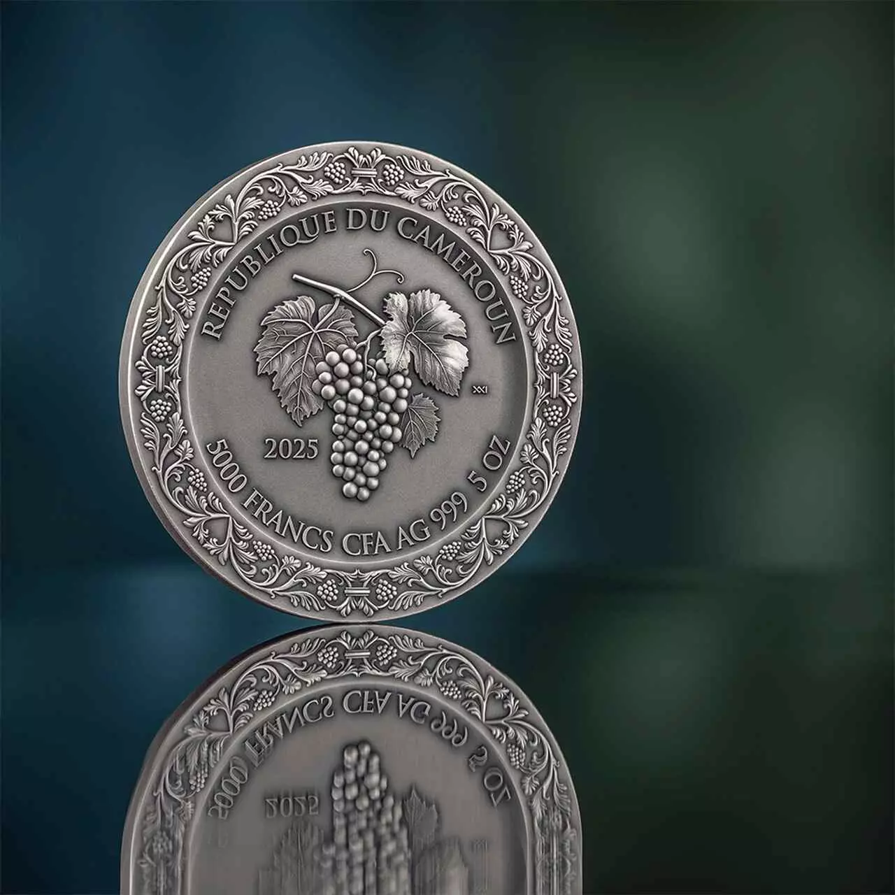 Awers przedstawia kiść winogron wraz z informacjami o monecie.