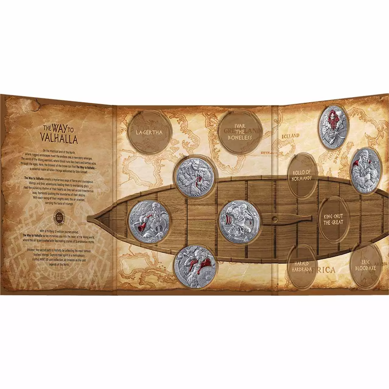 Szósta moneta z serii przestawia Björna Ironside’a, jednego z najbardziej znanych i szanowanych wojowników w historii wikingów, który wyróżniał się odwagą i walecznością. Był synem Ragnara Lothbroka i Lagerthy. Björn jest znany przede wszystkim ze swoich wyczynów i najazdów na Europę, a także ze swojej roli w ustanowieniu królestw wikingów na Morzu Śródziemnym i poza nim.