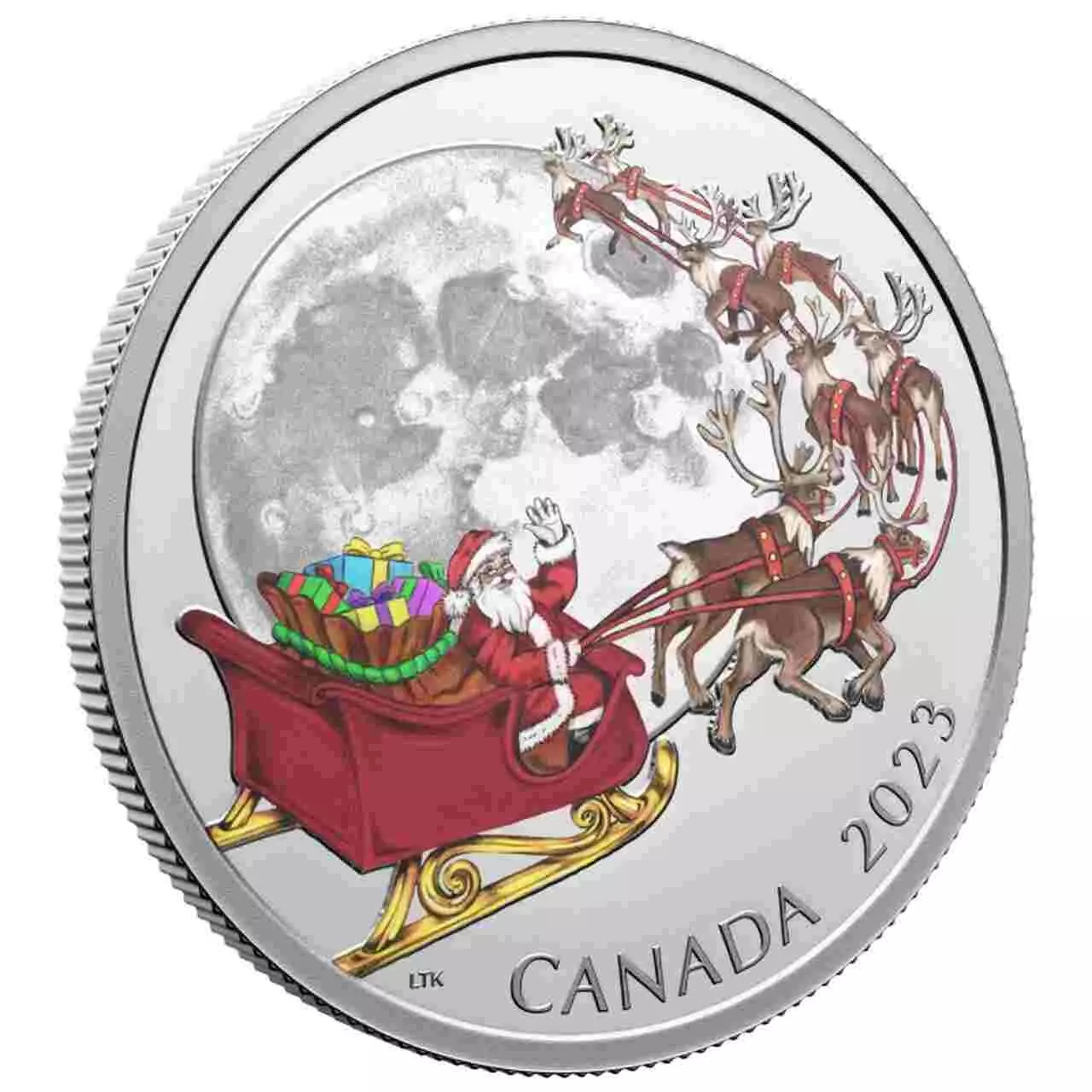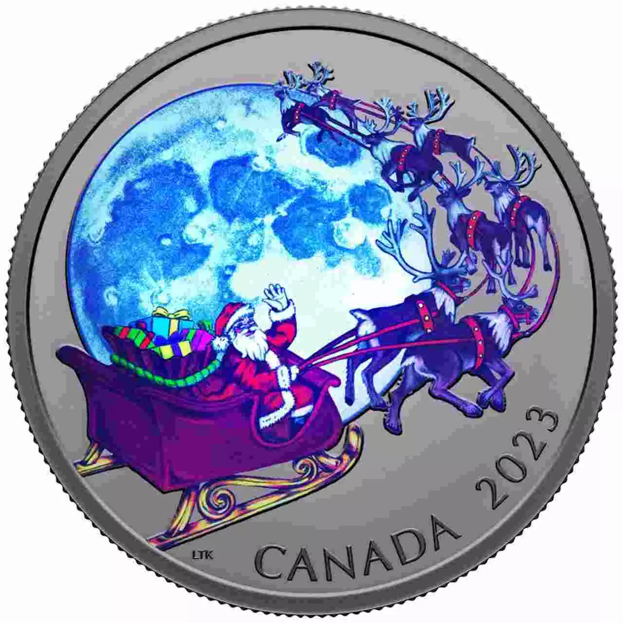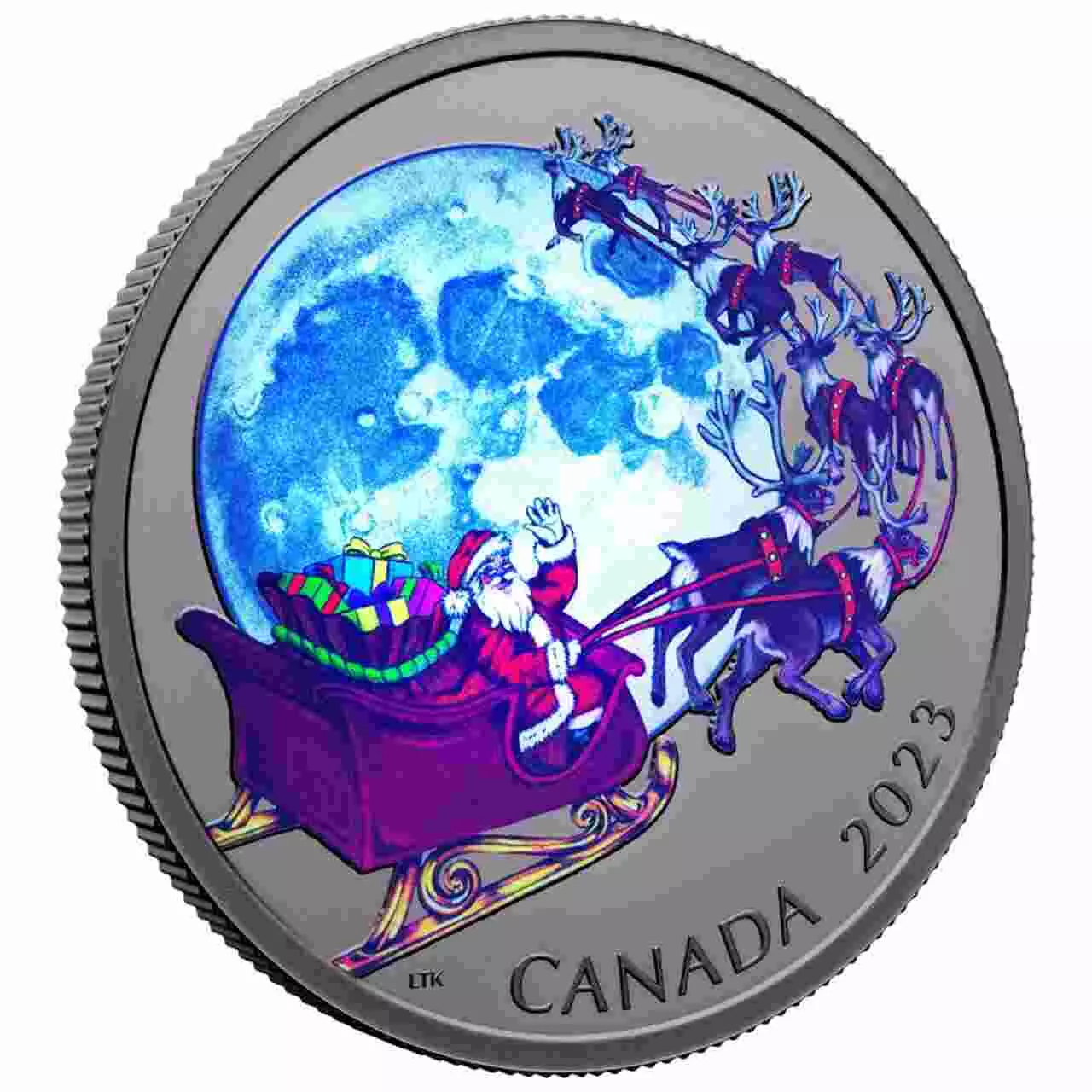 Rewers monety przedstawia Świętego Mikołaja lecącego saniami z reniferami na tle księżyca, tworząc klasyczny, bajkowy obraz kojarzony ze świąteczną noc. Moneta wyróżnia się niezwykłym efektem świecenia w ciemności, który sprawia, że rewers nabiera magicznego charakteru po zgaszeniu światła.\