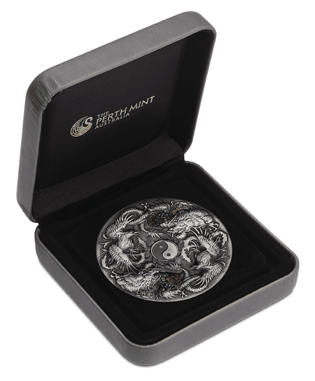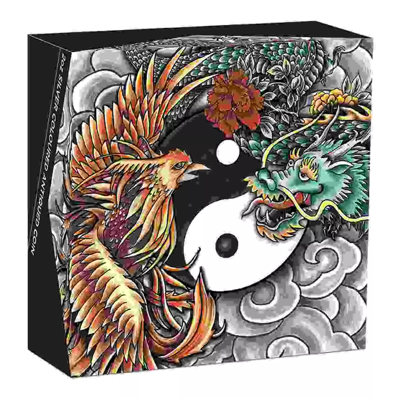 Double Dragon and Phoenix Yin Yang został wybity ze srebra najwyższej próby. Moneta o wadze dwóch uncji posiada selektywną kolorystykę, ciekawy wzór oraz jakość w wykończeniu antycznym. Dwuncjowy format umożliwił w pełni rozwinąć bogactwo detali i nadać całości imponujący, przestrzenny charakter.