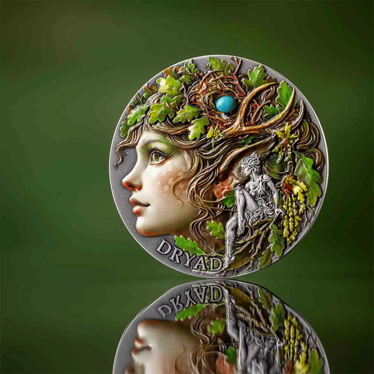 Dryad to srebrna moneta próby 999 o wadze 2 uncji. Takie parametry zapewniają jej wysoką wartość inwestycyjną i kolekcjonerską. Dzięki wykorzystaniu techniki High Relief oraz antycznego wykończenia każdy detal monety zyskuje wyjątkową głębię i wyrazistość.