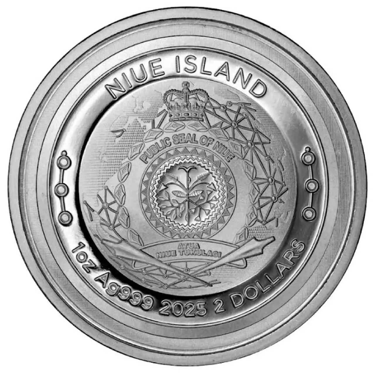 Awers ukazuje godło Niue wraz z podstawowymi informacjami o walorze. Awers stanowi wspaniały kontrast dla futurystycznego rewersu, łącząc temat cyfrowy z tradycyjnym zaufaniem numizmatycznym.