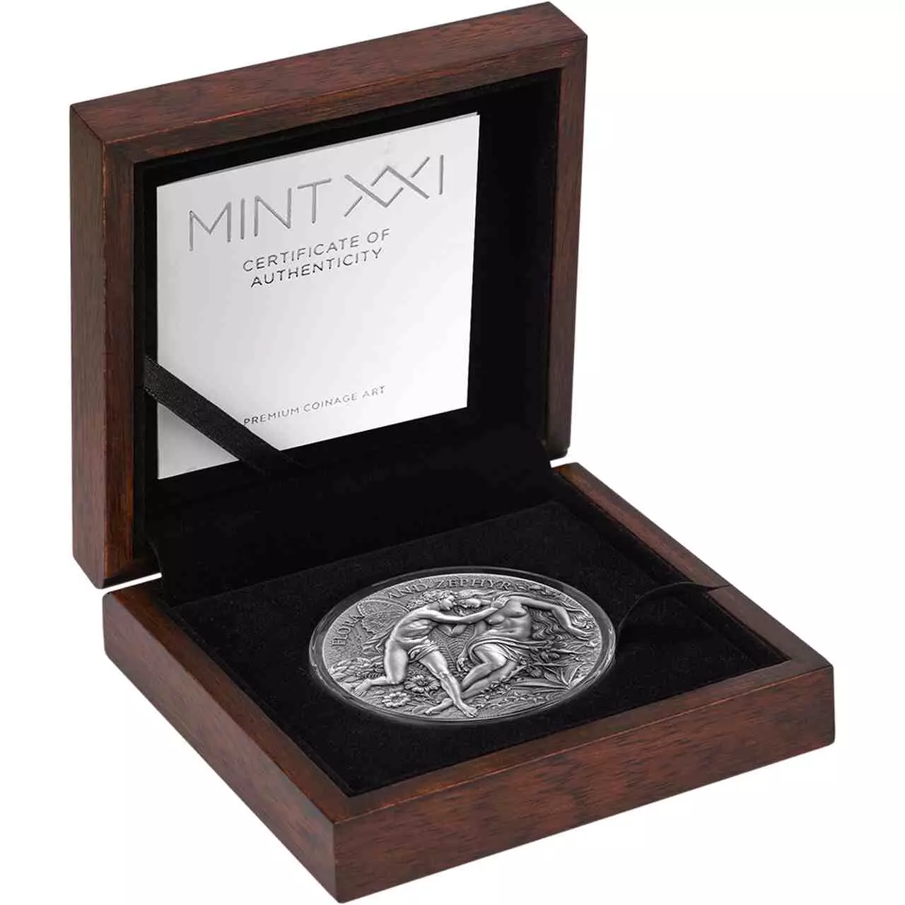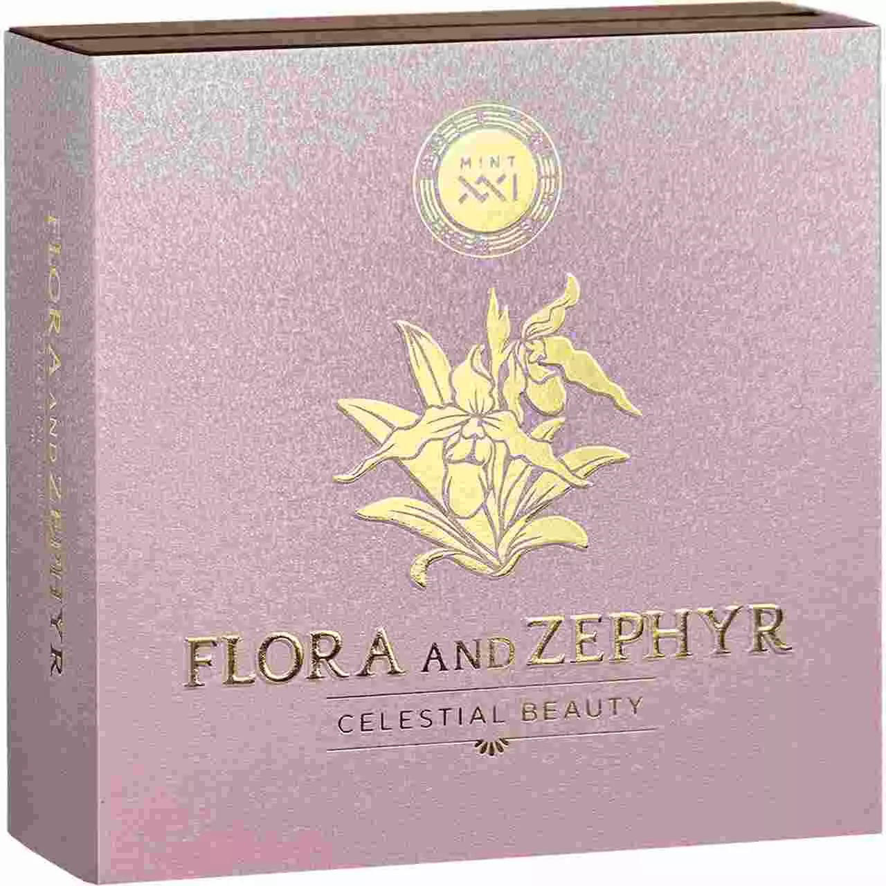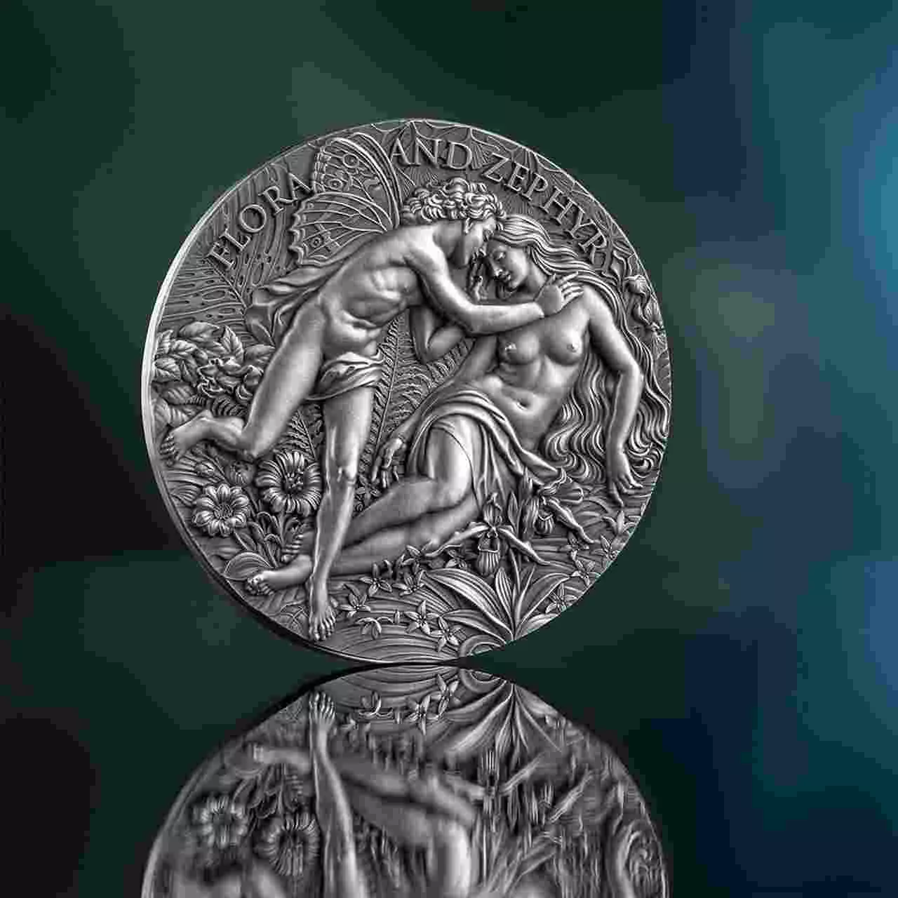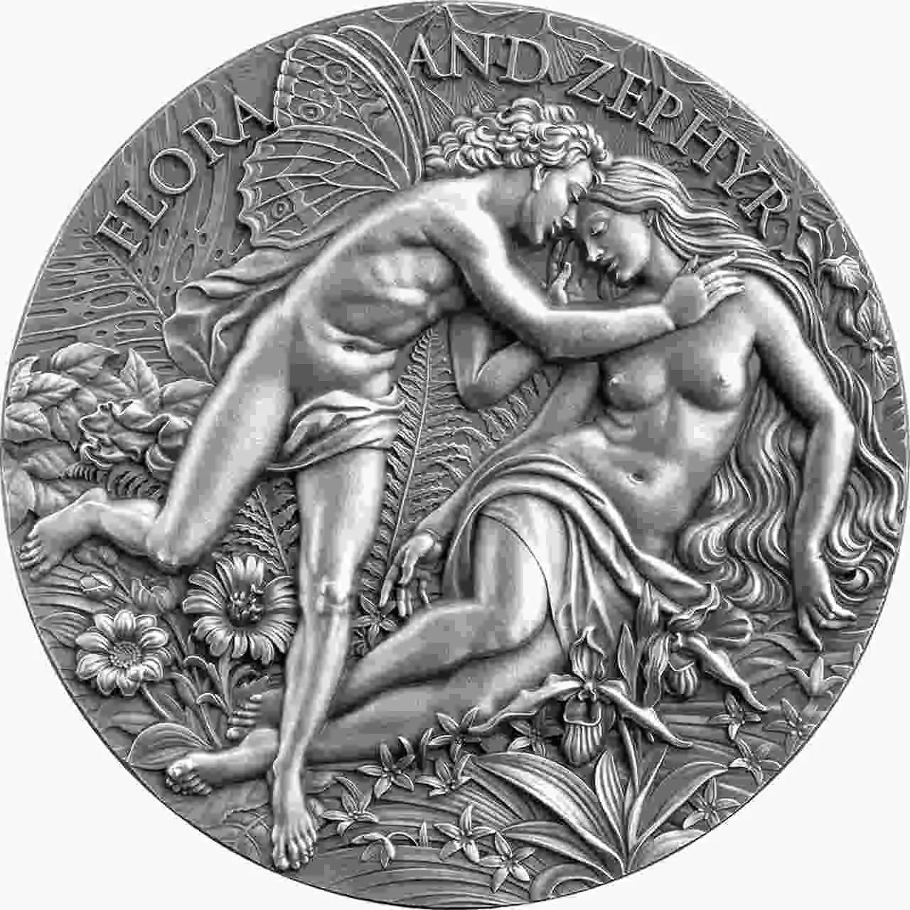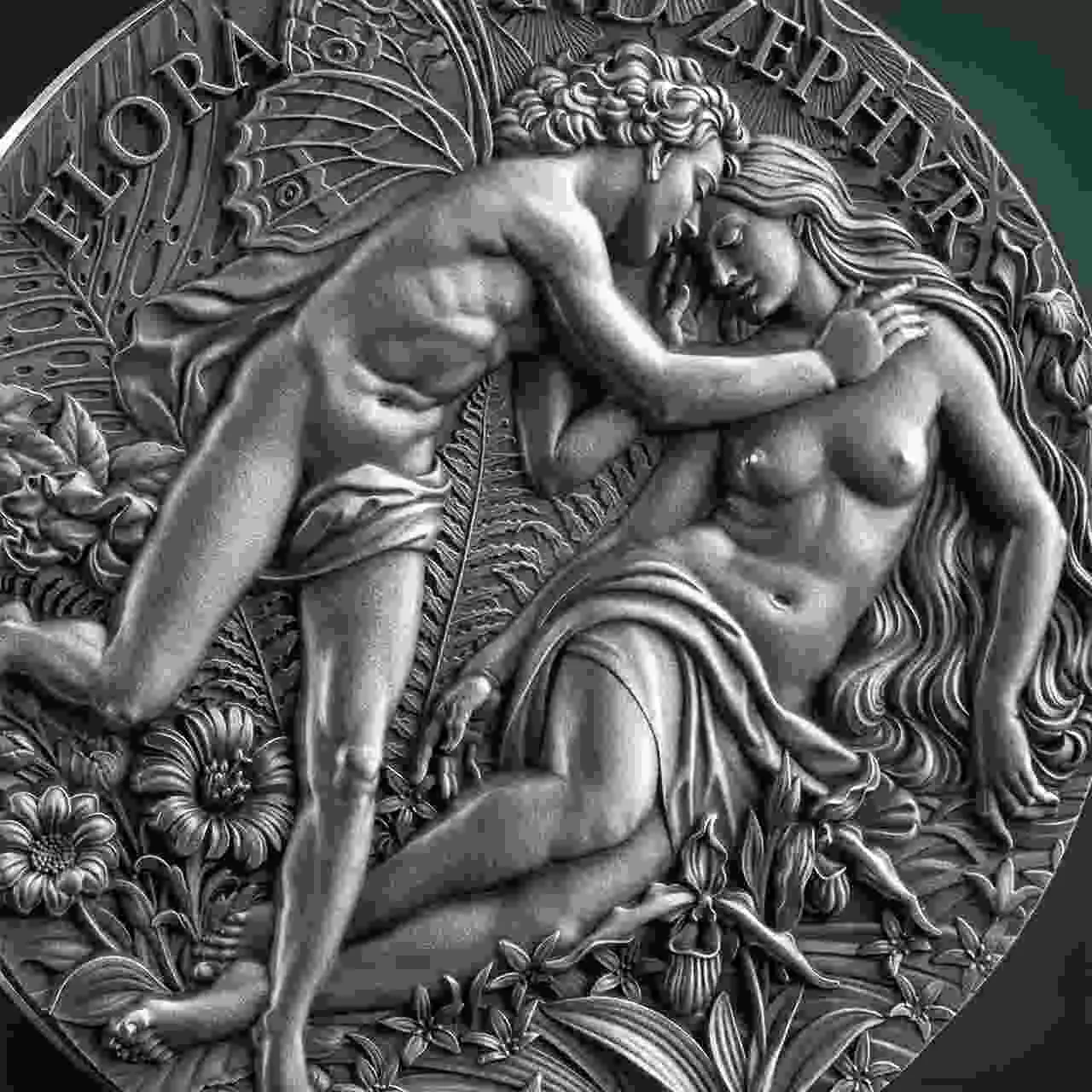 Flora and Zephyr zawiera dwie uncje srebra najwyższej próby i została wybita w jakości high relief. Moneta posiada antyczne wykończenie, które łagodzi światło, przywołując fakturę. Natomiast wysoki relief nadaje scenie rzeźbiarską głębię, pozwalając, aby misternie odwzorowane detale ukazały się w oszałamiającym realizmie.