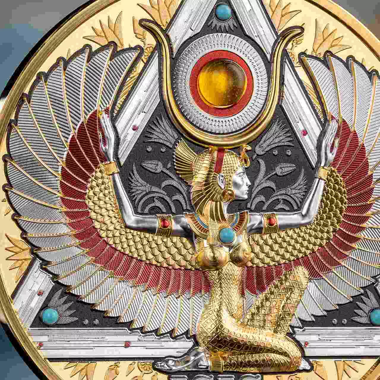 Isis zawiera pięć uncji czystego srebra próby 999. Moneta została wybita w jakości high relief oraz przyozdobiona wkładką turkusową oraz bursztynową, selektywnym złoceniem oraz posiada kolorowy nadruk.