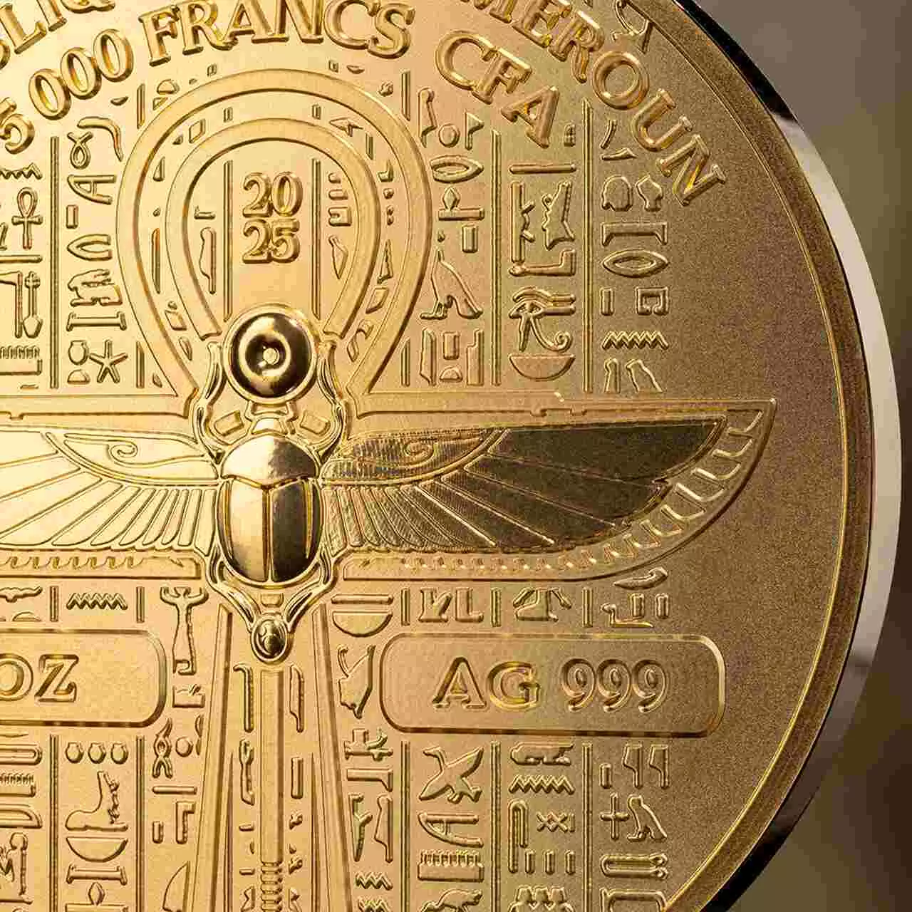 Awers ukazuje egipskiego skarabeusza na tle krzyża Ankh otoczonego mozaikami z hieroglifów.