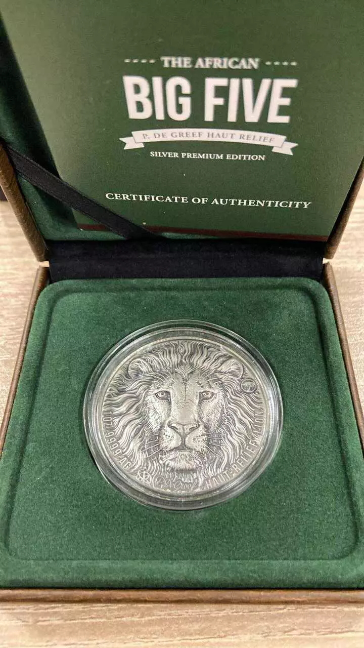 Moneta z serii Big Five Africa została poświęcona lwu afrykańskiemu, będącego jednym z najbardziej rozpoznawalnych i majestatycznych drapieżników świata. Przypisuje mu się tytuł króla afrykańskiej sawanny. Samce wyróżniają się okazałą grzywą oraz potężną sylwetką z wagą wynoszącą nawet 250 kg. Ich donośny ryk słyszalny jest z kilku kilometrów. Lew jest jedynym kotem żyjącym w stadach. Od wieków jest symbolem siły, odwagi, władzy i przywództwa.