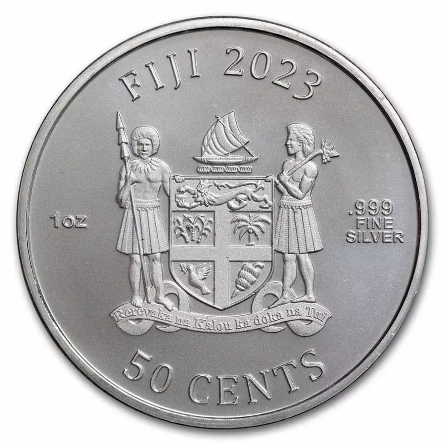 Awers przedstawia herb Fidżi, rok, wagę srebra i czystość wraz z nominałem.