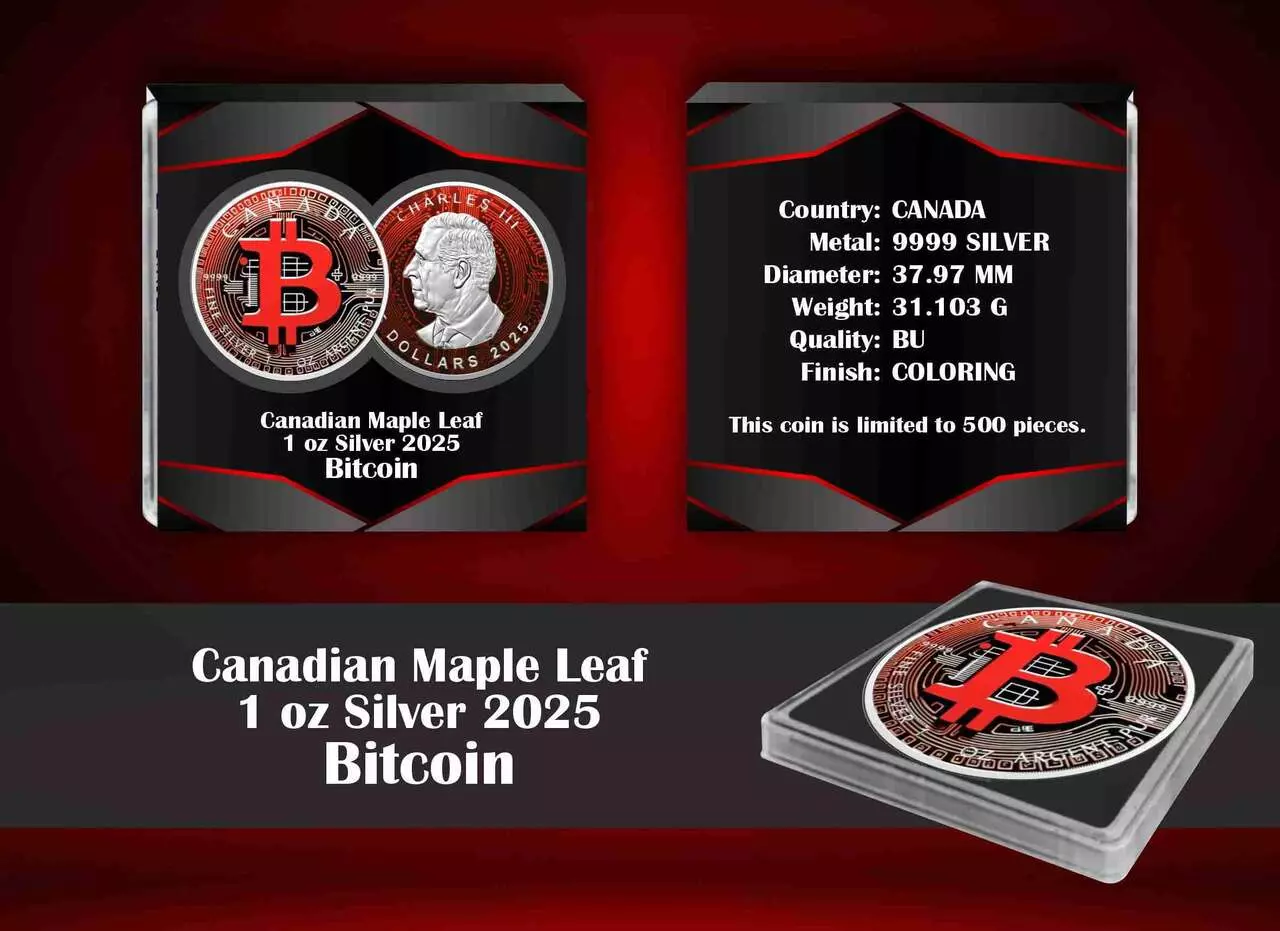 Kanadyjski Liść Klonowy Bitcoin to srebrna moneta bulionowa Kanadyjski Liść Klonowy o wadze 1 uncji, która posiada kolorowy nadruk UV.