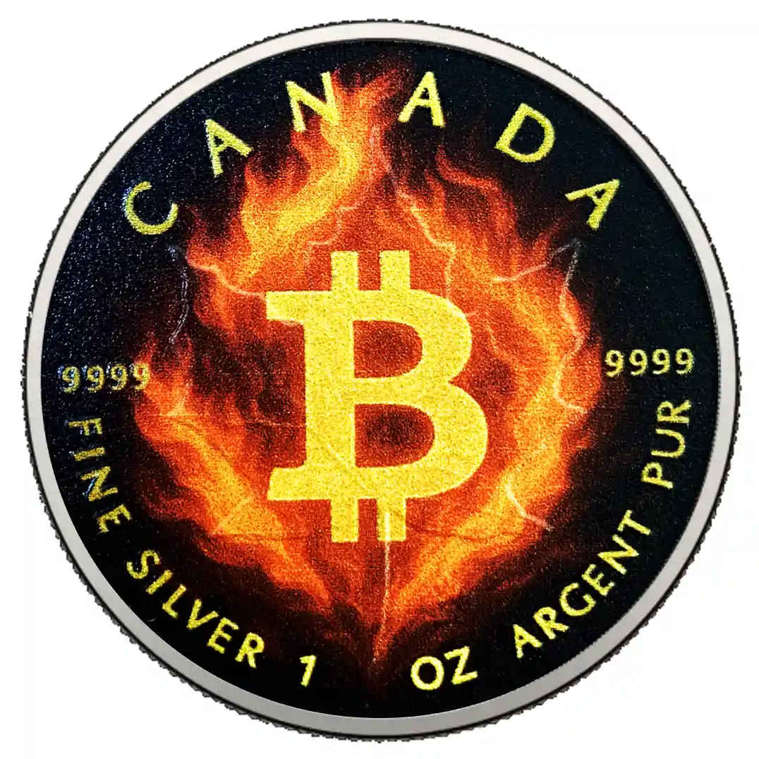 Srebrna Moneta Kanadyjski Liść Klonowy 1 uncja srebra 2025 – Płonący Bitcoin