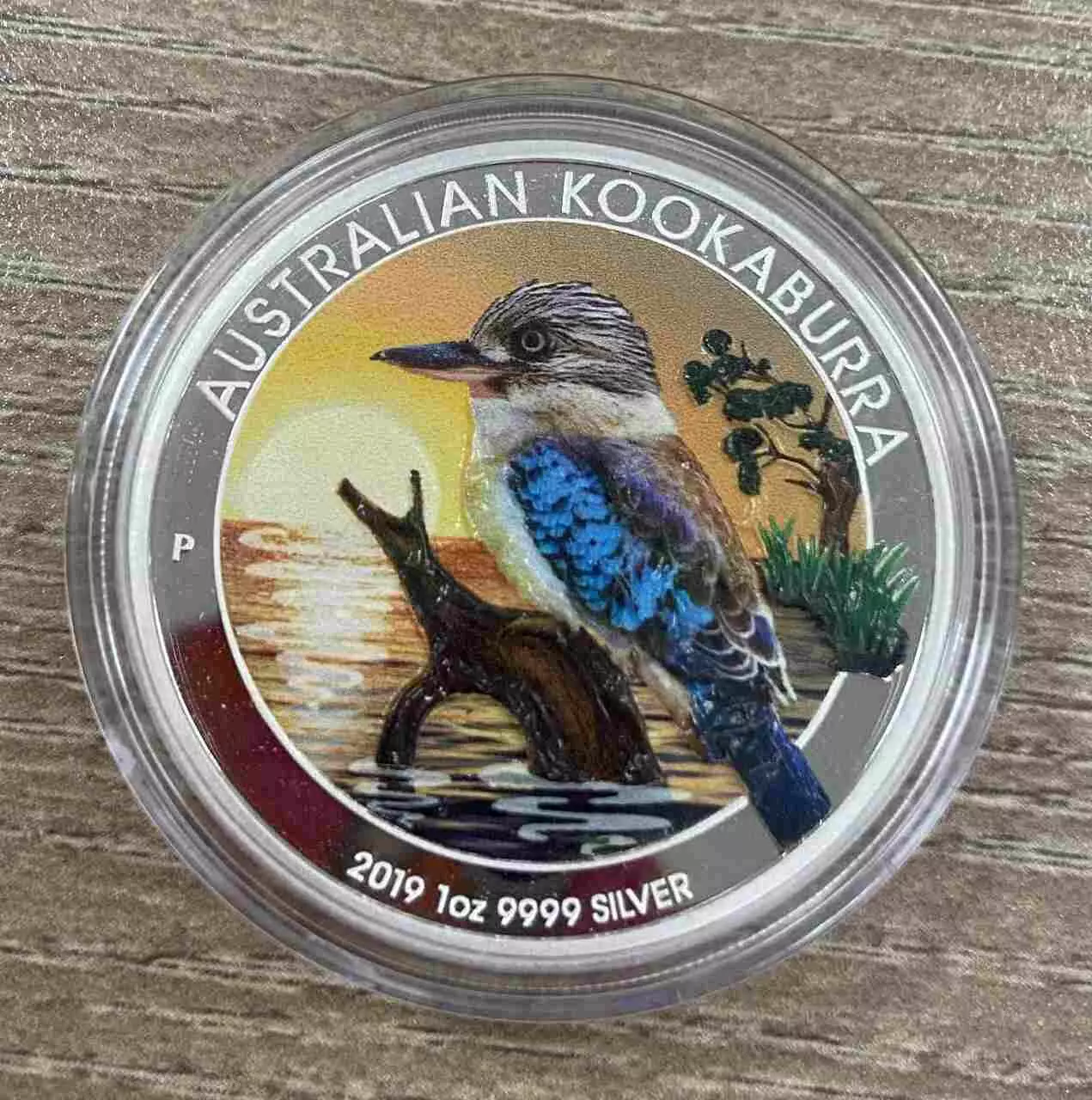 Rewers monety przedstawia kookaburrę siedzącą na wystającej z wody z gałęzi na tle zachodzącego słońca. Motyw zachodzącego słońca został pokreślony kolorowym nadrukiem, tworząc wyjątkową głębie.