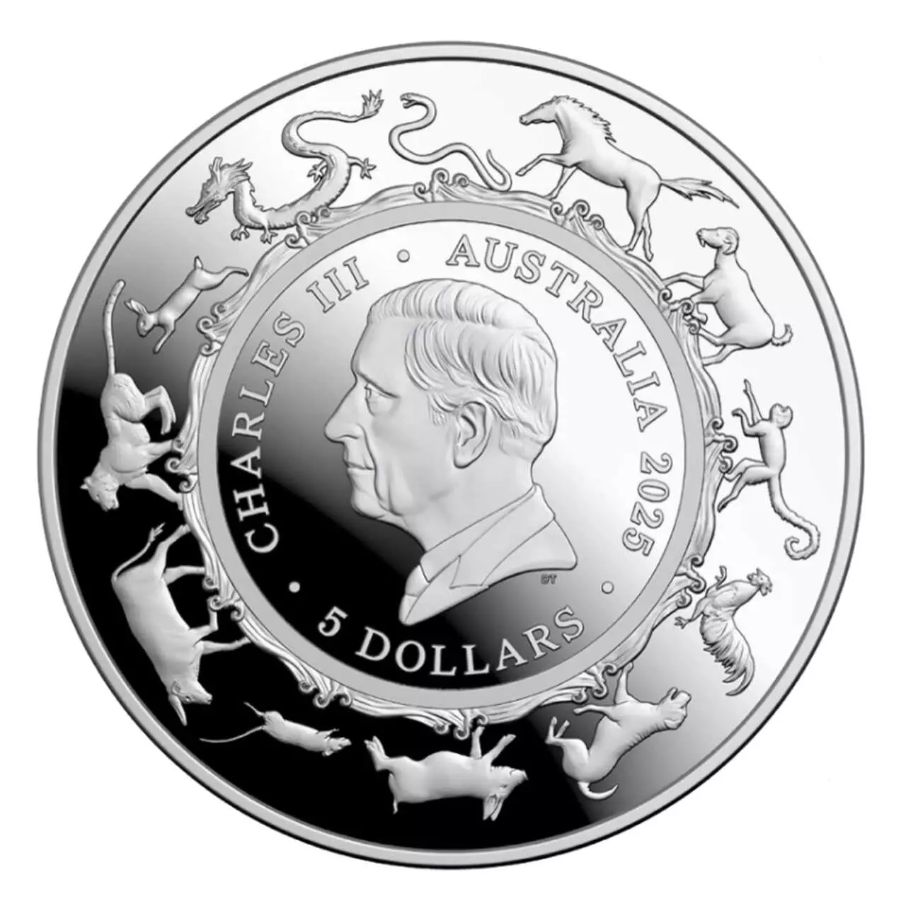 Awers zdobi wizerunek Króla Karola III otoczonego wizerunkami zwierząt z chińskiego kalendarza lunarnego.