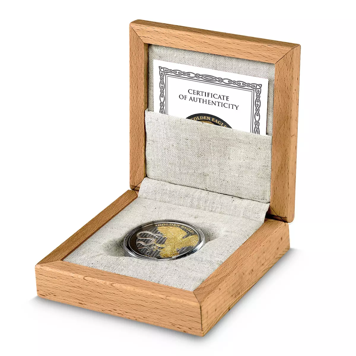Monety dostarczane w drewnianym pudełku wraz z certyfikatem autentyczności.